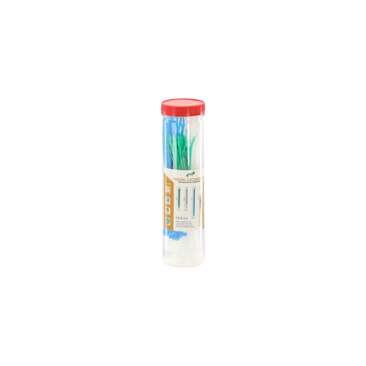 - 50 pcs 2.5 × 100 mm – green; 50 pcs 2.5 × 100 mm – white; 50 pcs 2.5 × 150 mm – blue; 50 pcs 3.6 × 200 mm – white