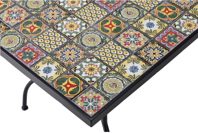 Stable metal legs with braces ensure strength and confidence on various surfaces. The smooth, washable mosaic surface is easy to maintain, making the table great for everyday use and weekend barbecues. Easily pair it with rattan or metal chairs to create a harmonious outdoor set.