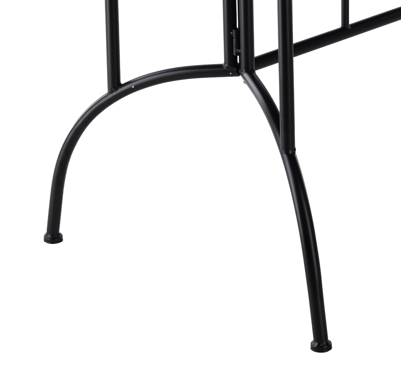 The black metal base with cross braces and curved accents provides excellent stability and durability for everyday use on the terrace or in the garden.