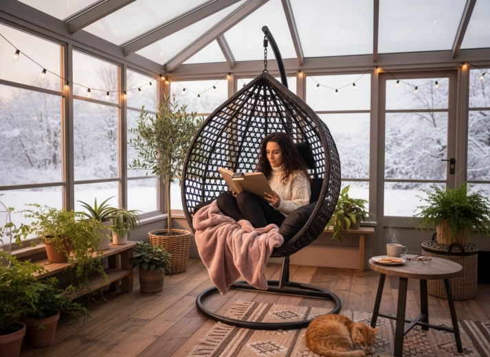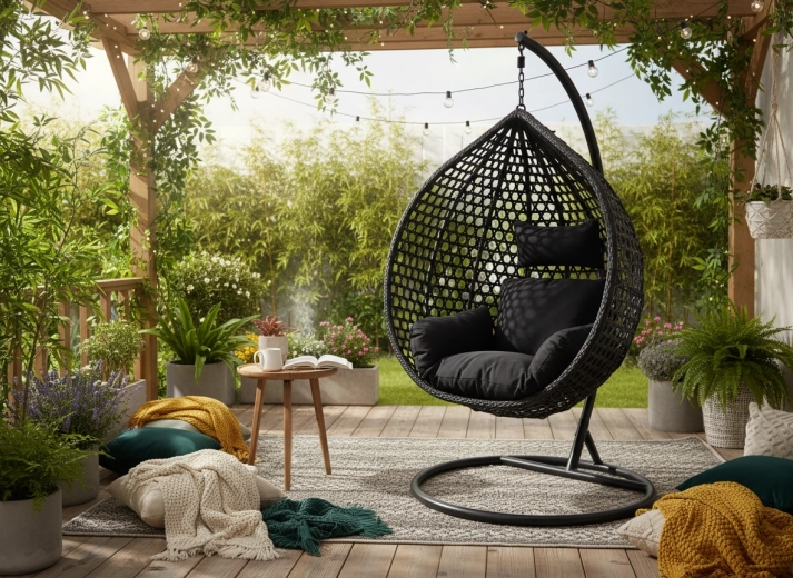 Thanks to the timeless black color, the chair fits both modern and natural arrangements. It is ideal for terraces, pergolas, balconies, and living rooms, providing a place for reading, relaxing, or a short nap.