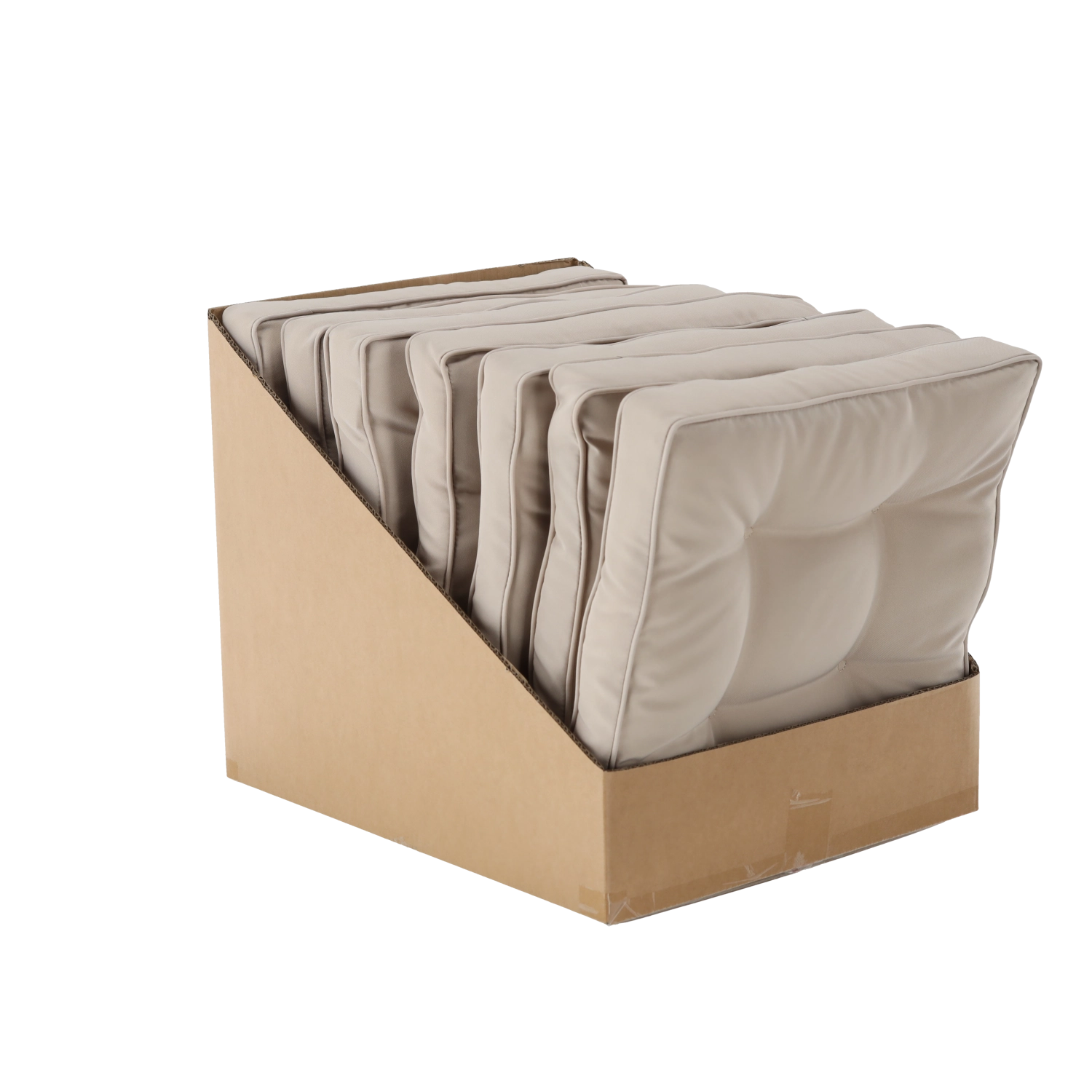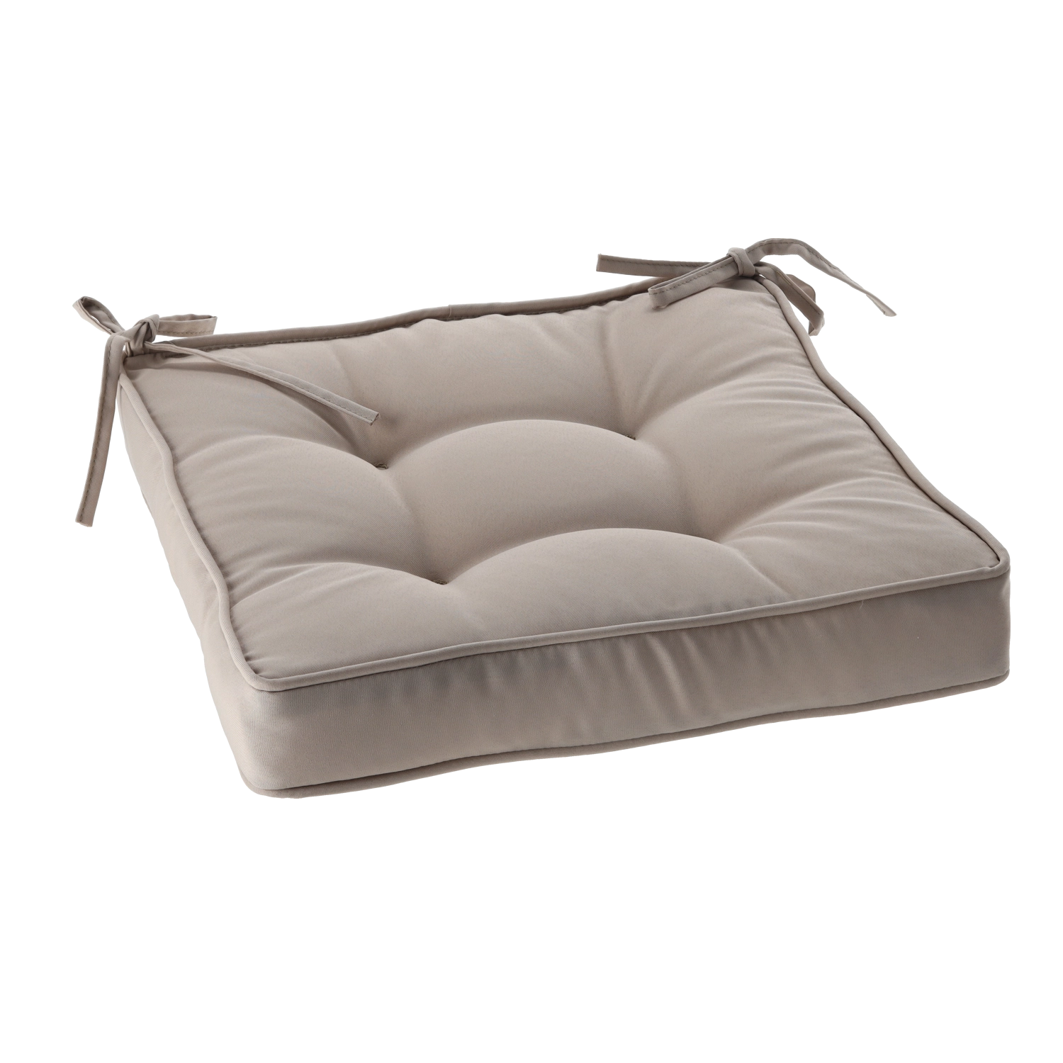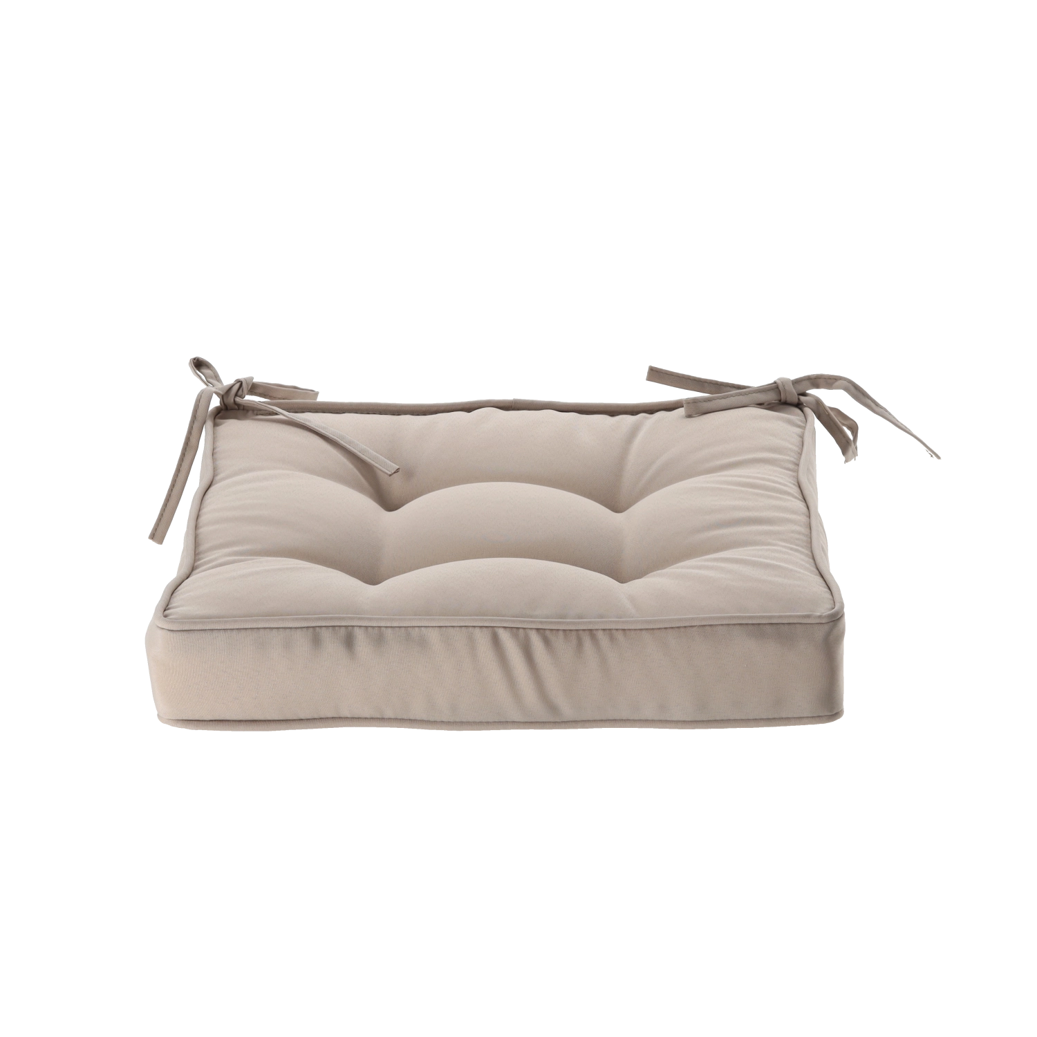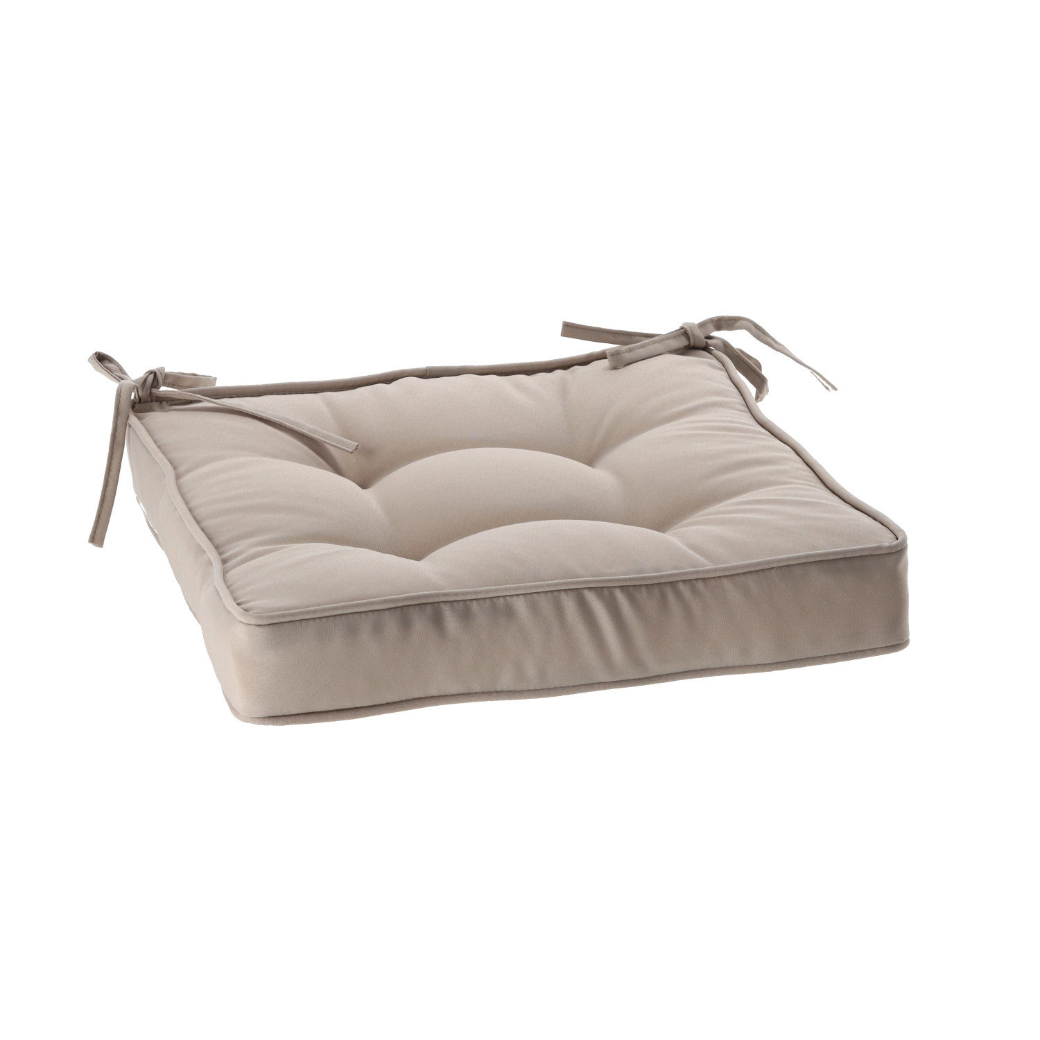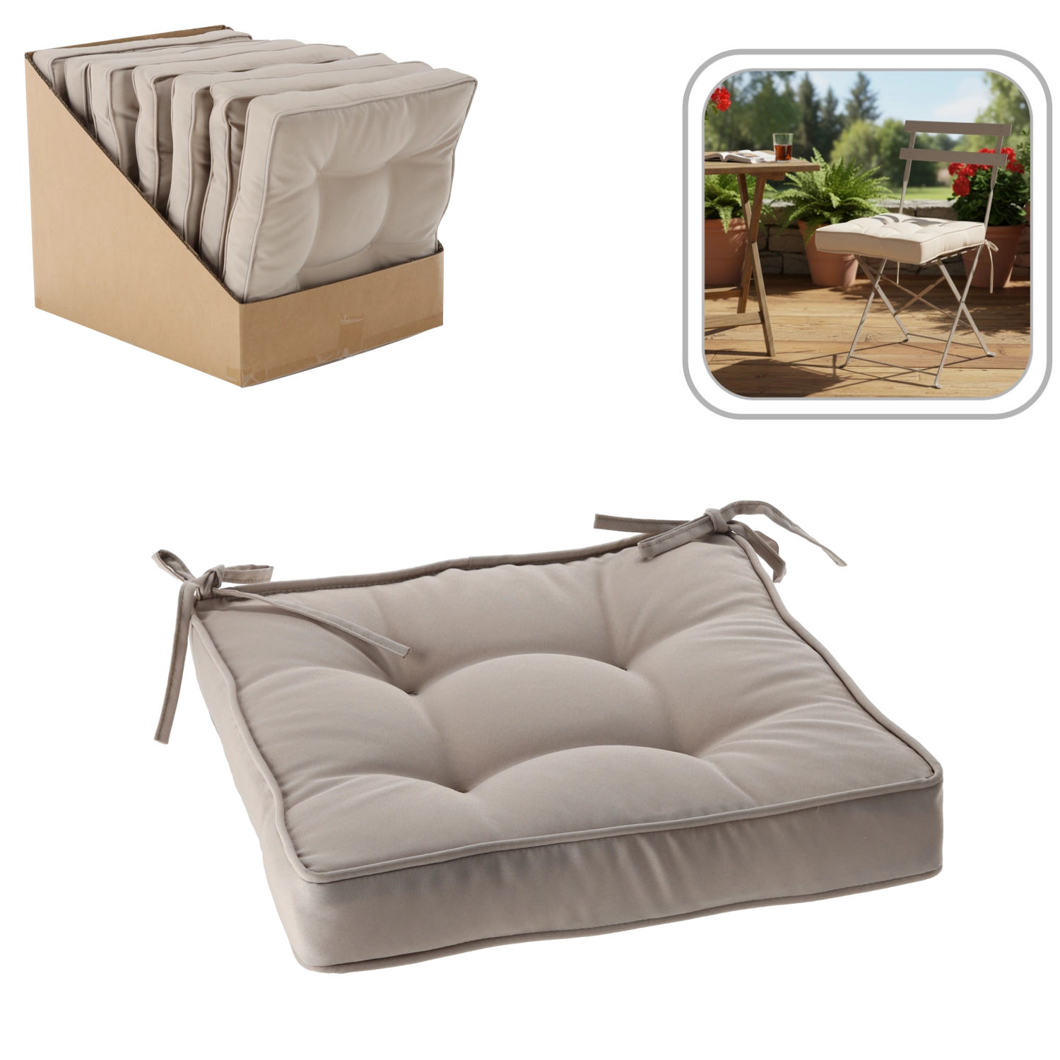 Enjoy comfortable seating with an elegant chair cushion in a natural color. Thanks to its 6 cm thickness, soft filling, and practical tie strings, it stays securely in place. The durable cover made of 100% polyester is easy to maintain, and the four tufted points help it keep its shape even with daily use.