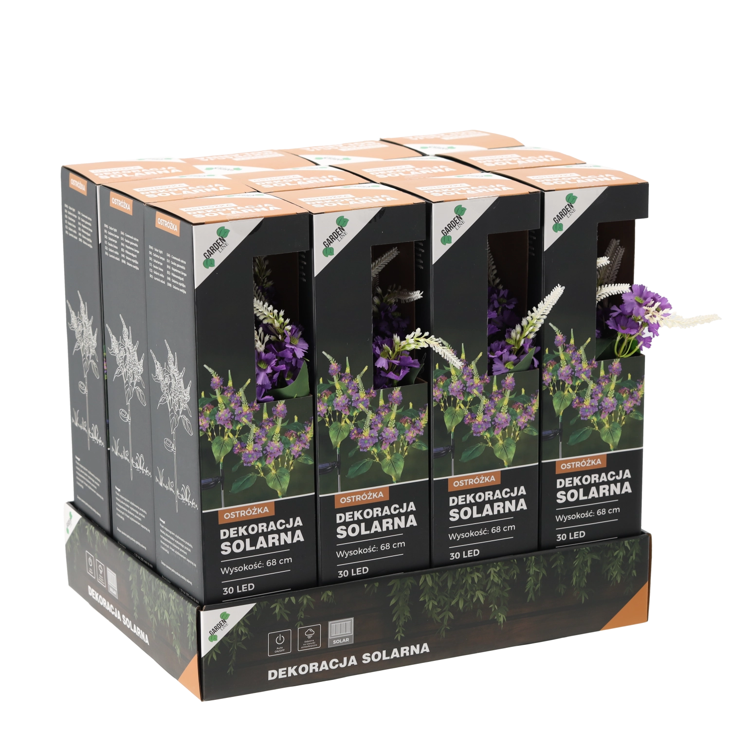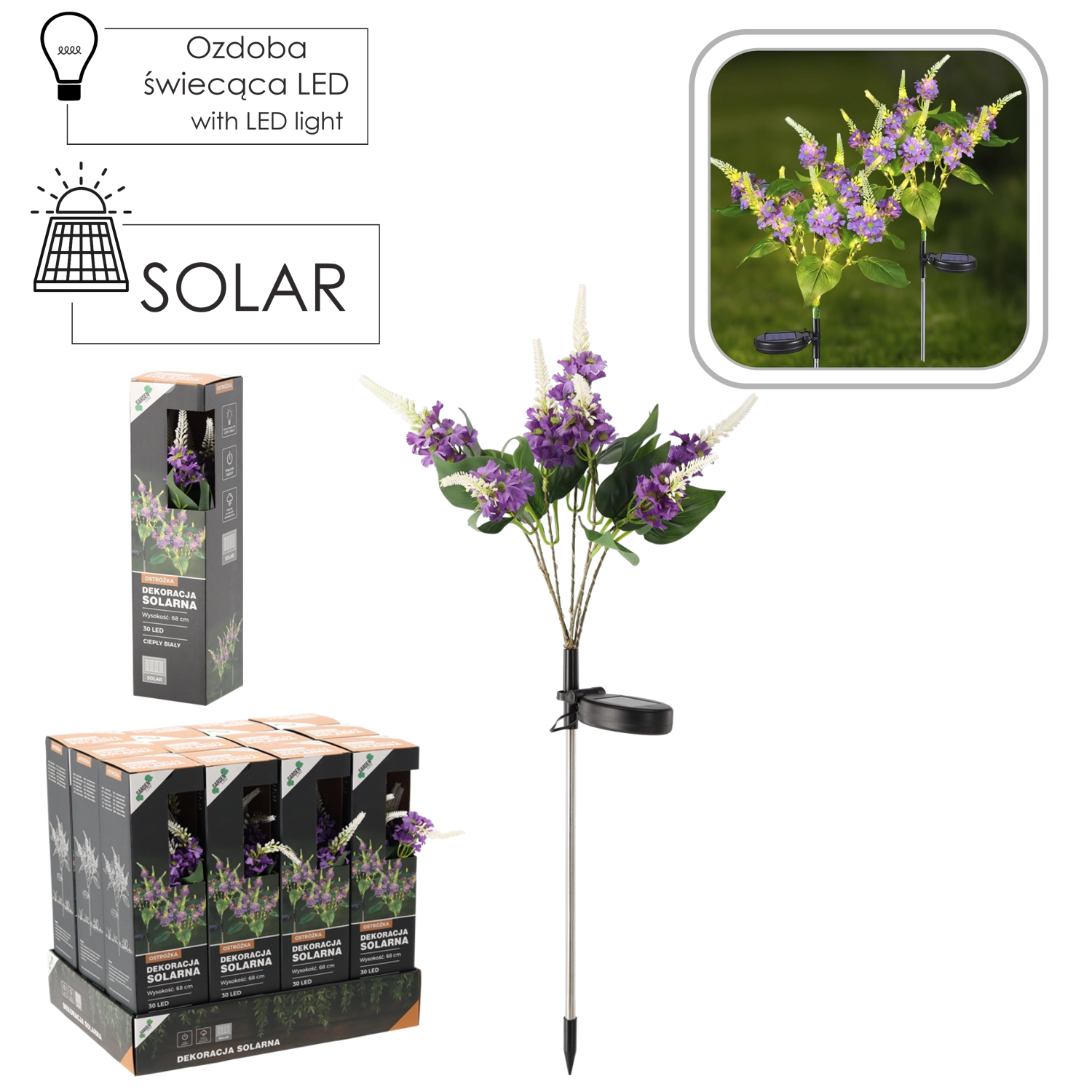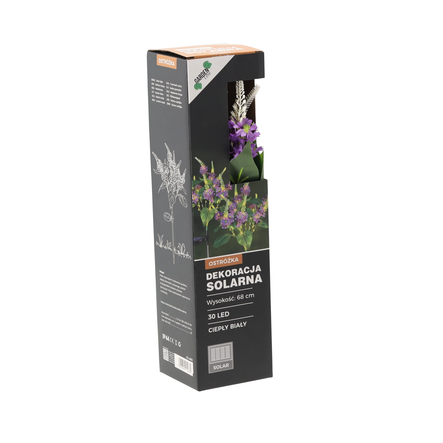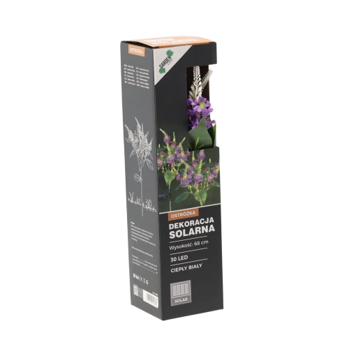 An elegant 68 cm solar garden lamp that brightens your outdoor space with a pleasant warm white light. With 30 LEDs and IP44 weather resistance, it’s ideal for outdoor use. It charges via a solar panel and offers up to 6–7 hours of runtime after a full charge.