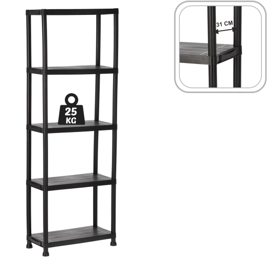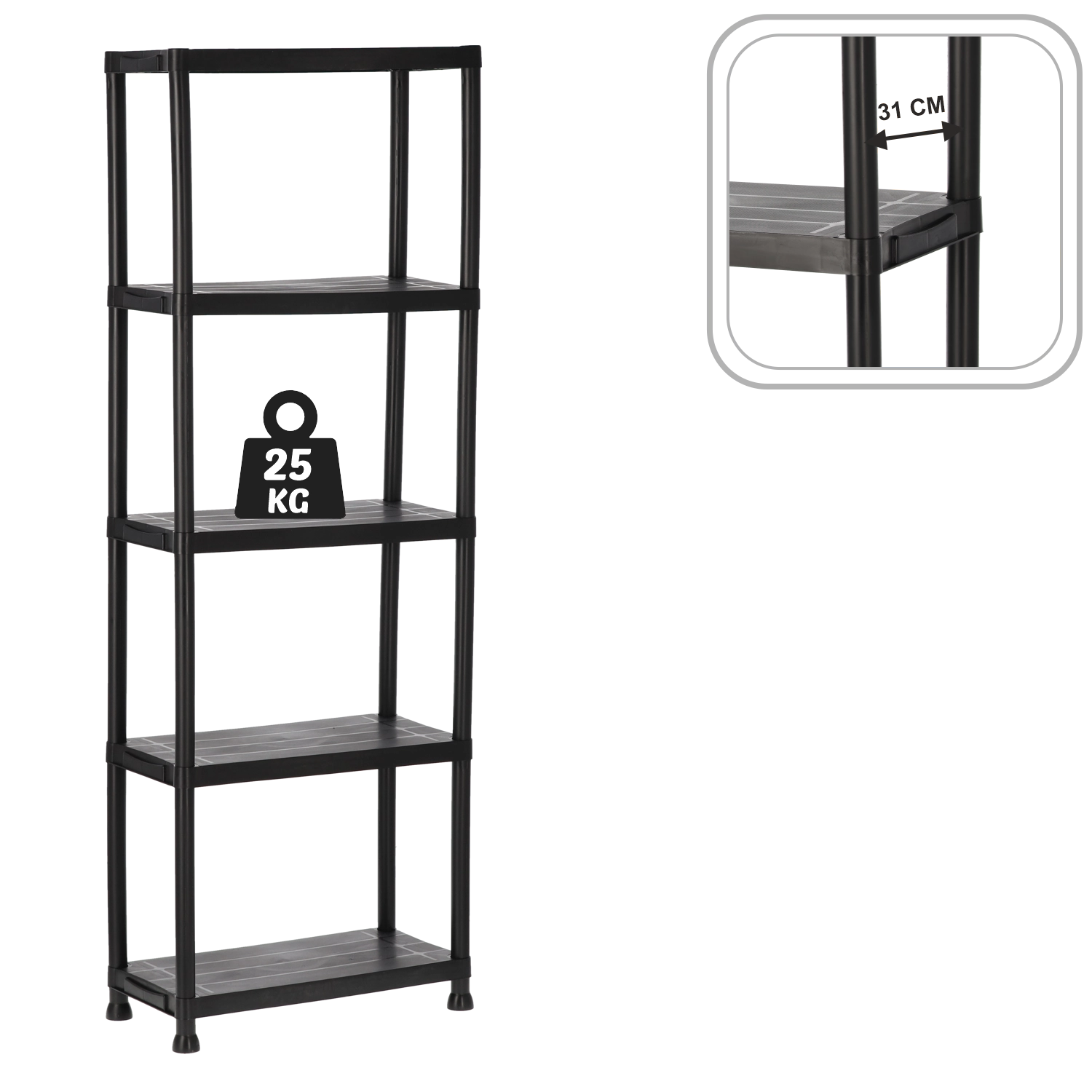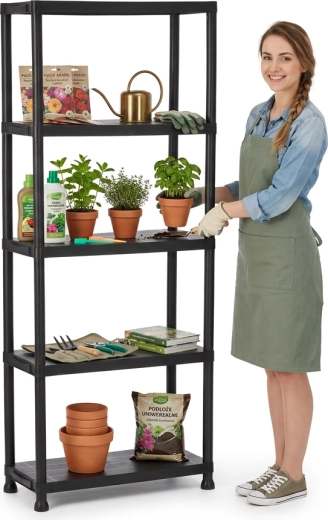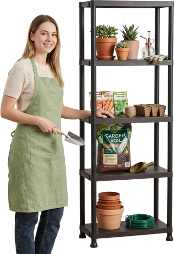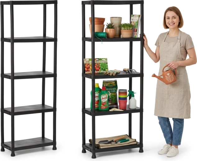Maximize your space with this 5-tier plastic shelving unit measuring 61 × 31 × 171 cm. Its slim footprint saves room, while robust shelves with a 25 kg capacity reliably hold tools, cleaning products, boxes, planters, and household supplies. The open frame makes handling easier and improves air circulation, keeping stored items visible and within quick reach.