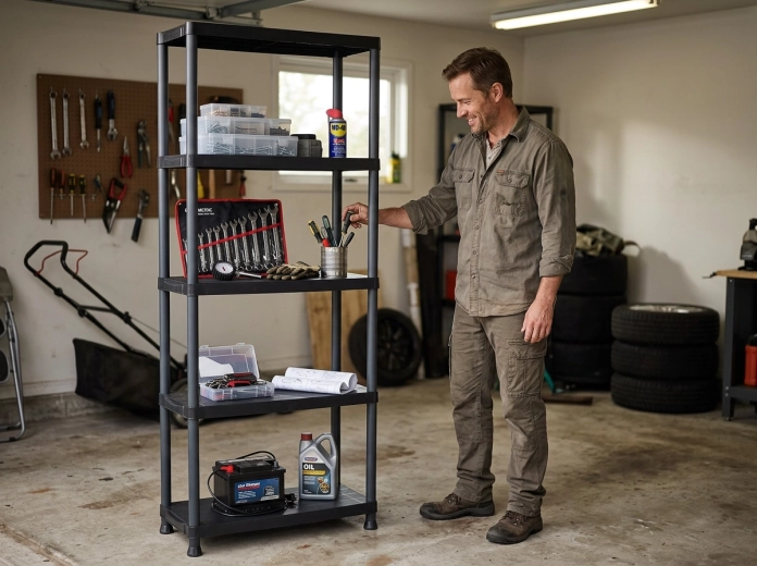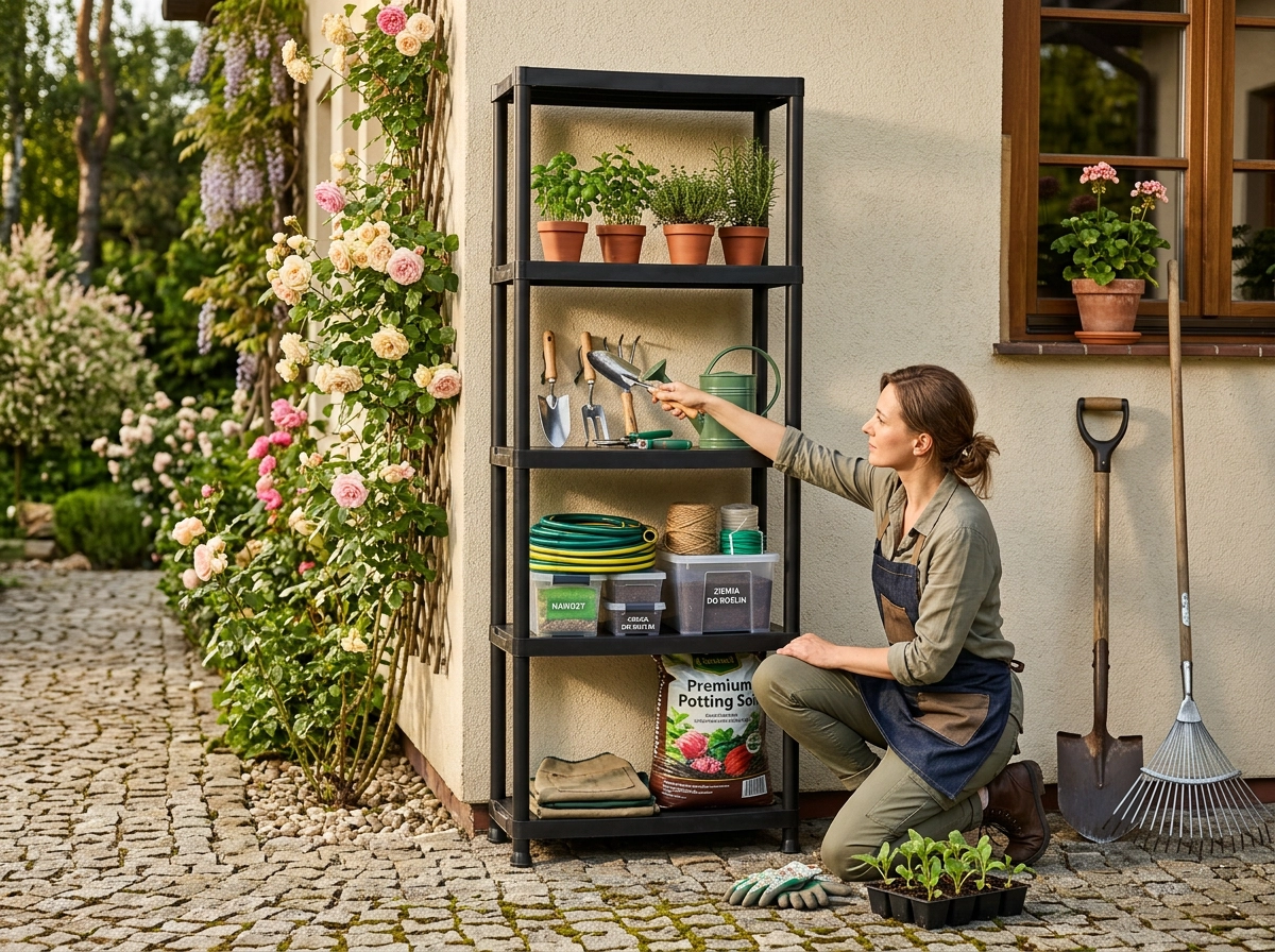 The shelving unit is ideal for the garage, utility room, basement, and for garden equipment. The plastic design resists moisture, cleans easily, and is lightweight for moving. Simple assembly without special tools saves time—you can set it up in no time.