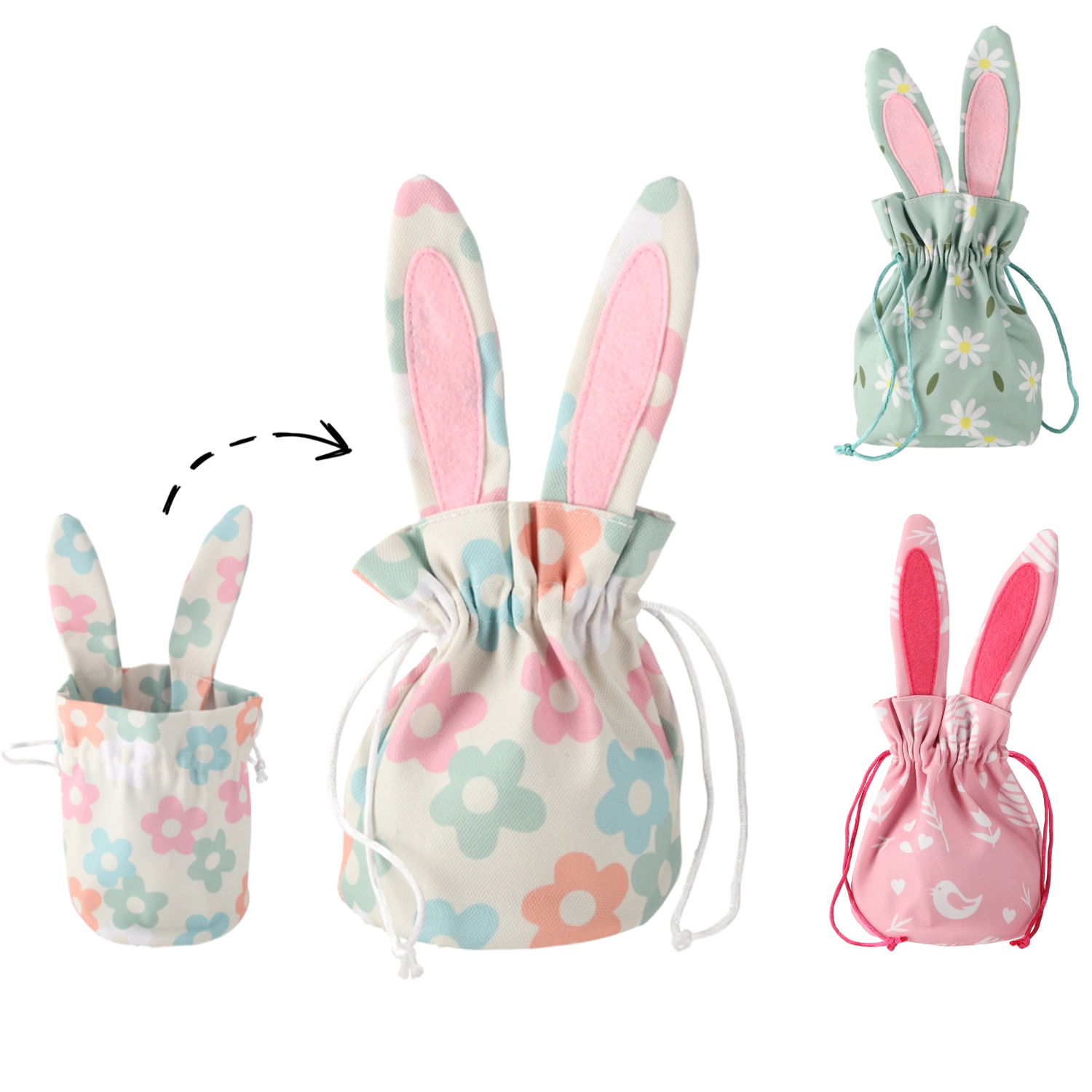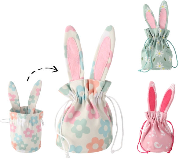 A cute Easter basket with bunny ears measuring 15.5 × 26 cm, ideal for decoration and practical storage of small items. It offers three stylish patterns, sturdy construction, and plenty of space for eggs, sweets, or small gifts. Thanks to quality materials and a versatile design, it suits not only Easter but also year-round decor.