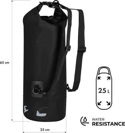 Durable 500D PVC with polyester and a roll-top closure with buckles protect your gear from water, mud, and rain – ideal for the river and the campsite.