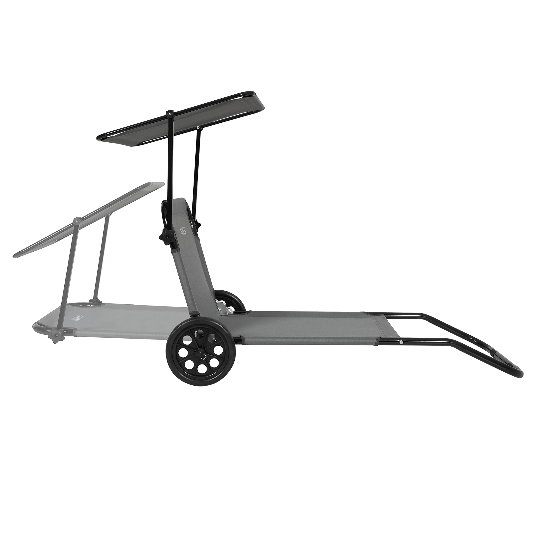 The NILS Camp beach lounger in grey is the ideal companion for relaxing by the water, camping, or lounging in the garden. The stable steel frame with 25 × 1 mm tubes ensures high load capacity and stability, while the durable material with a PE surface finish resists moisture and is easy to clean. The adjustable canopy protects from the sun, and two large wheels make it easy to move over sand and grass.