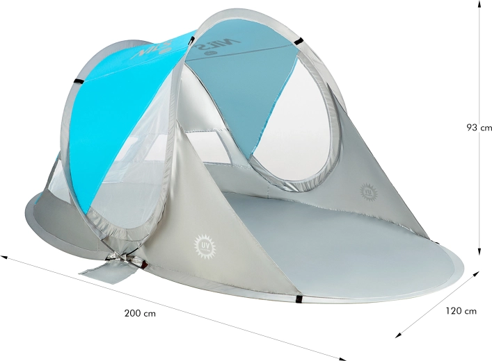 Thanks to its 96% UV reflectivity, the tent provides effective protection from harmful sunlight. The 200 × 120 cm floor and 93 cm height offer ample space for sitting and for kids to play. After use, you can easily fold the tent back into a compact 60 cm diameter case with a simple motion—ideal for convenient carrying and storage.
