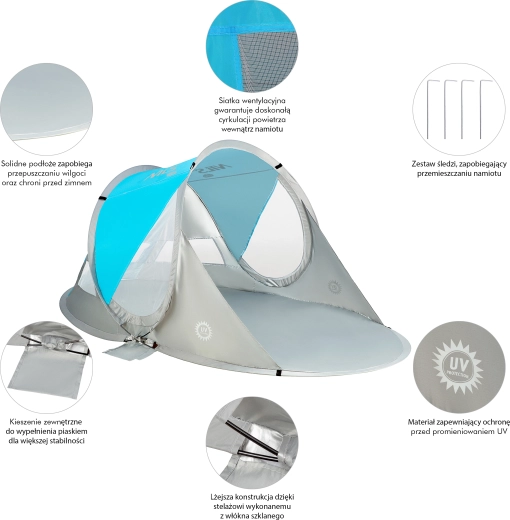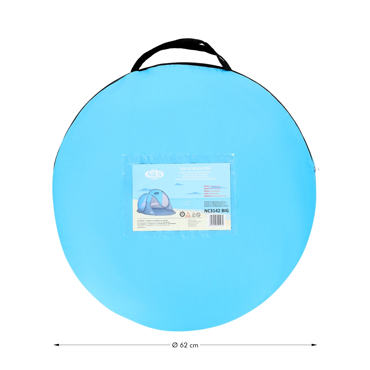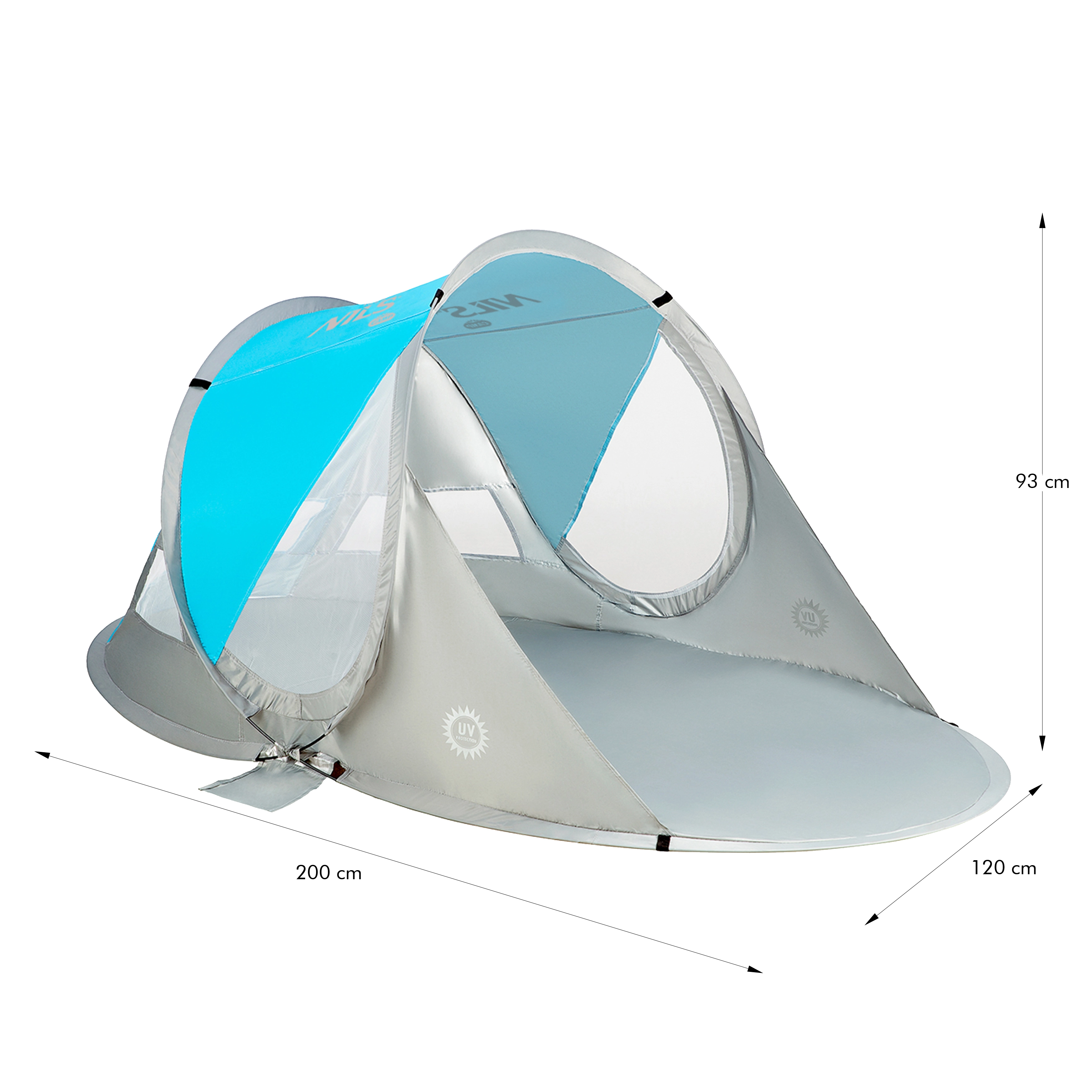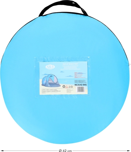 Enjoy comfort and safety at the beach or by the pool with the self-assembling NILS Camp NC3143 BIG tent. It offers instant setup, up to 96% UV protection, shade and wind shelter, and easy carrying in a round bag. With dimensions of 200 × 120 × 93 cm, it suits both children and adults, and the durable polyester flysheet can handle a light shower.