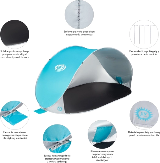 A lightweight and compact beach tent for comfortable relaxation at the seaside, pool, or in the garden. It provides sun protection, reflects up to 96% UV radiation, and thanks to the pop-up system it is ready to use in an instant. The stable fiberglass frame and durable polyester canopy protect against wind and light showers.