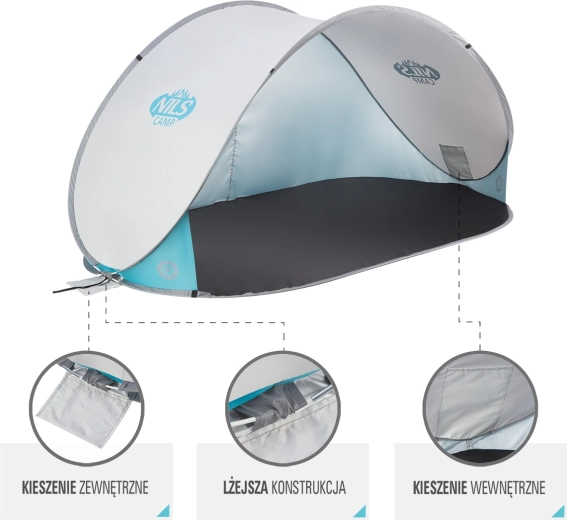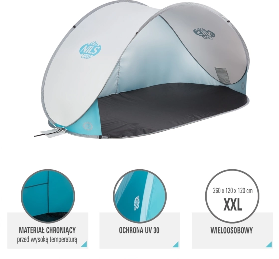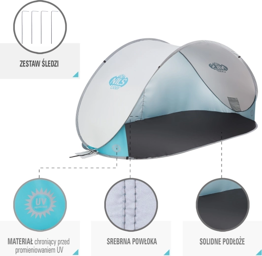 Enjoy comfort and sun protection anywhere with this self-pitching NILS Camp beach tent. It pops open right out of the bag, features a spacious 120 × 220 cm floor and 100 cm height, reflects up to 96% of UV radiation, and offers quick and easy packing. Lightweight, durable materials ensure reliable protection even during a light shower.