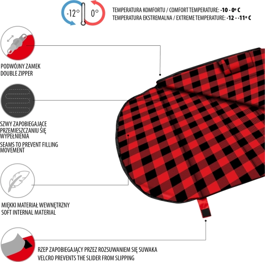 The package includes a compression sack with straps that reduces packed volume by about one third for easier transport. A comfort temperature of 0 °C and extreme of -12 °C make this model a reliable companion for cooler conditions.