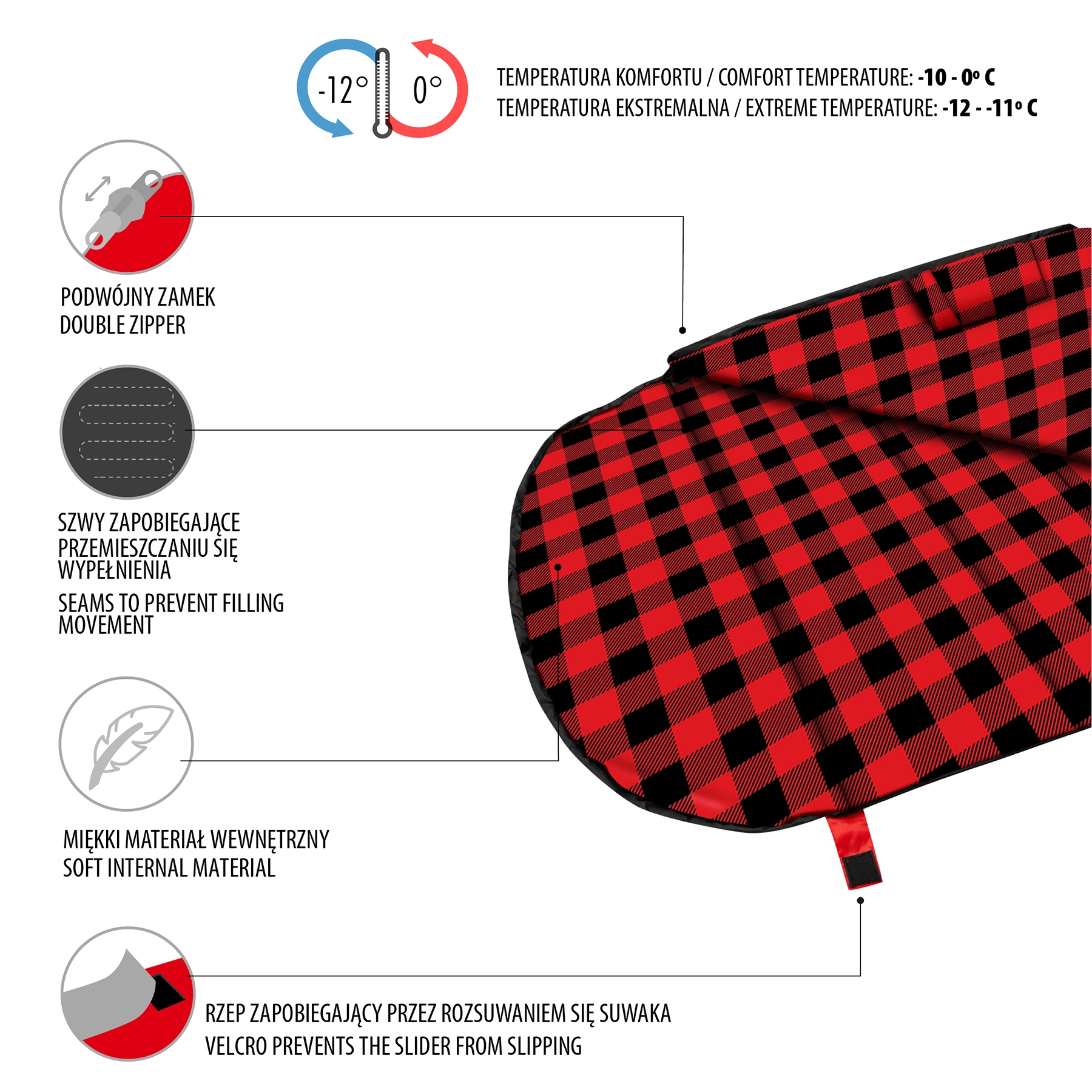 The practical two-way zipper is backed on the inside by an insulating draft tube and secured with a wide hook-and-loop cuff to prevent accidental opening during sleep. The long zipper along the side and bottom allows you to fully open the bag into a blanket – a great solution for warmer nights. The integrated hood with drawstring helps retain heat around your head.