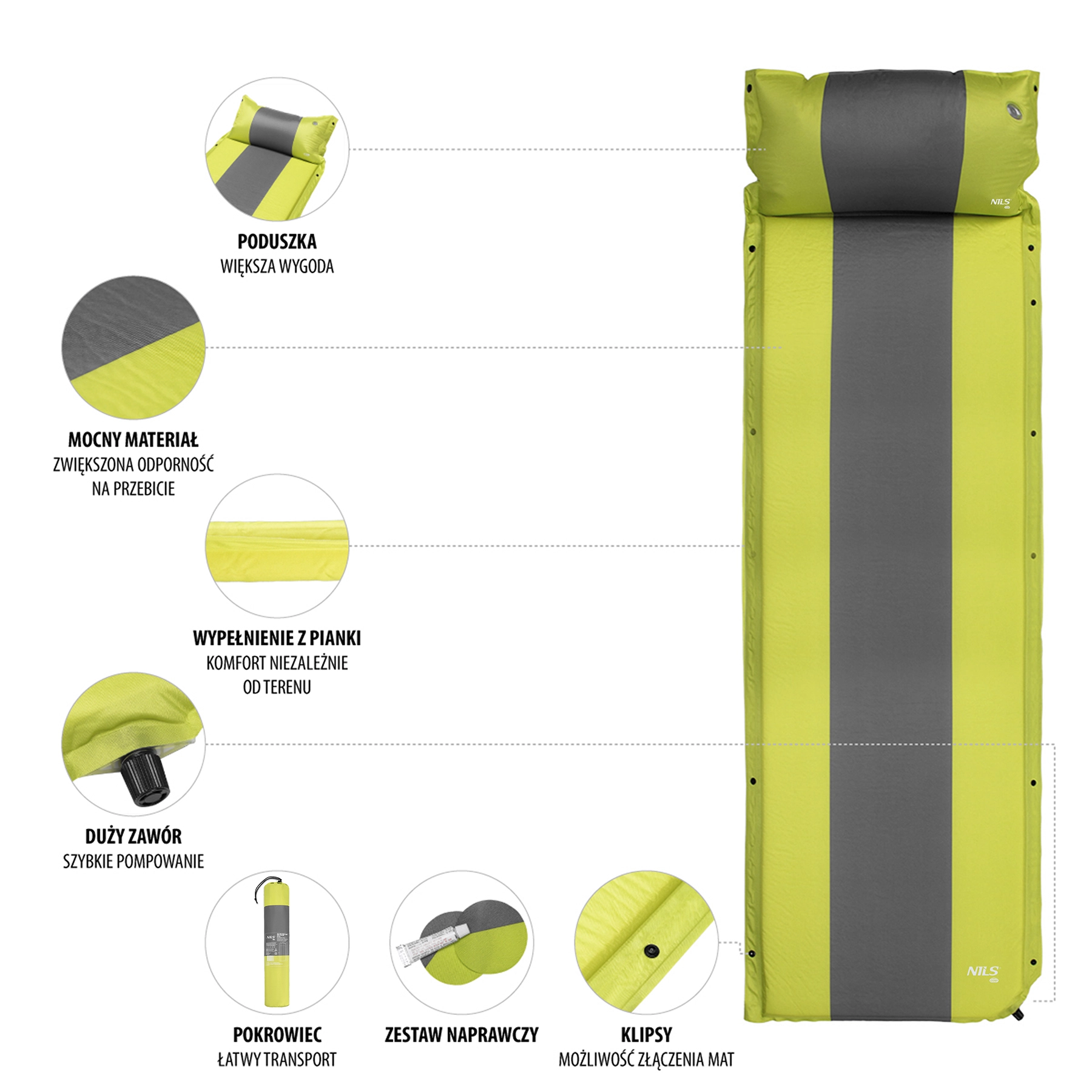 The robust combination of 75D polyester and PVC ensures high durability and use even on less even surfaces. Side snap buttons for joining allow you to connect multiple mats into one large area—great for family tents. The package includes a repair kit, compression straps with buckles, and a carry sack for easy transport.