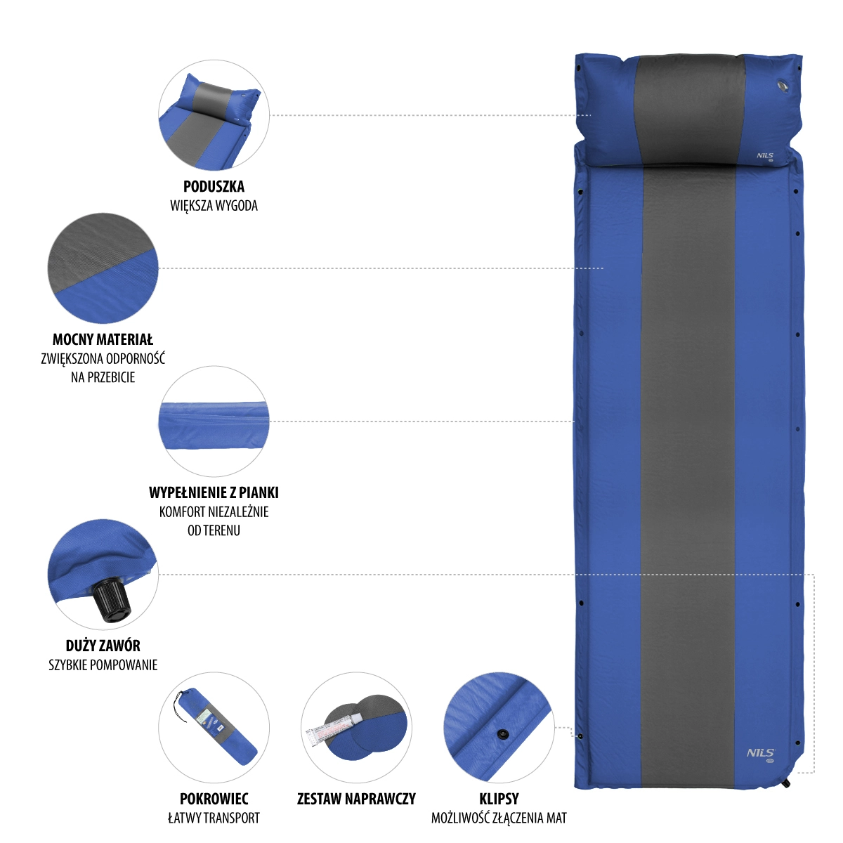 Durable 75D polyester with a PVC surface is easy to clean and water-resistant, making it suitable for campsites, tents, and waterside relaxation. Practical side snaps let you join multiple mats into one surface—an ideal solution for families or covering a tent floor. After use, deflate the mat easily by rolling it from the valve-free end, secure it with buckle straps, and store it in the carry sack.