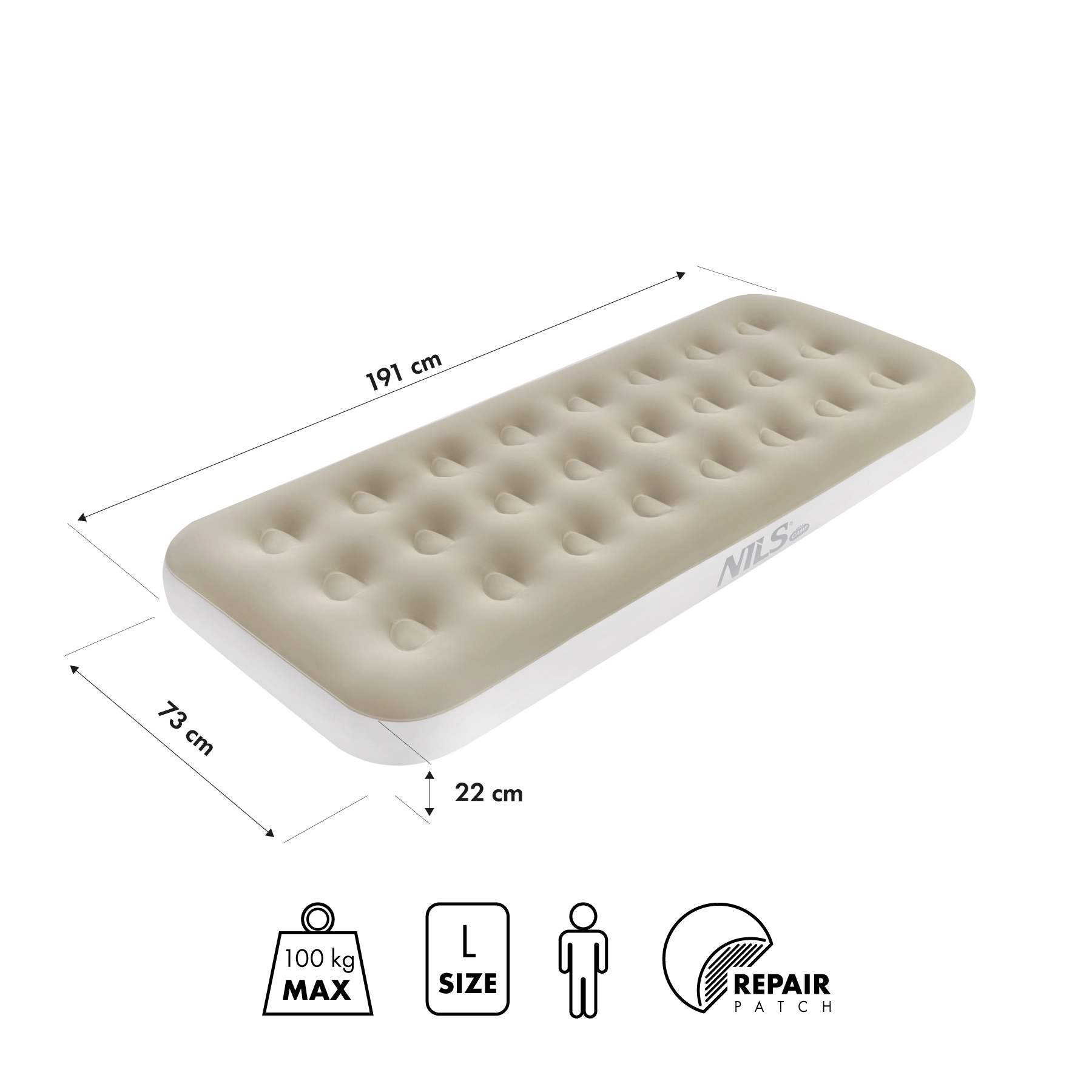 The 191 × 73 × 22 cm dimensions and 120 kg capacity make the mattress a great choice for camping, the garden, or as an extra bed at home.