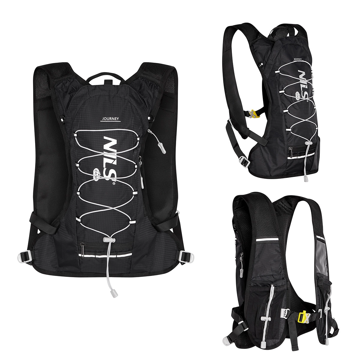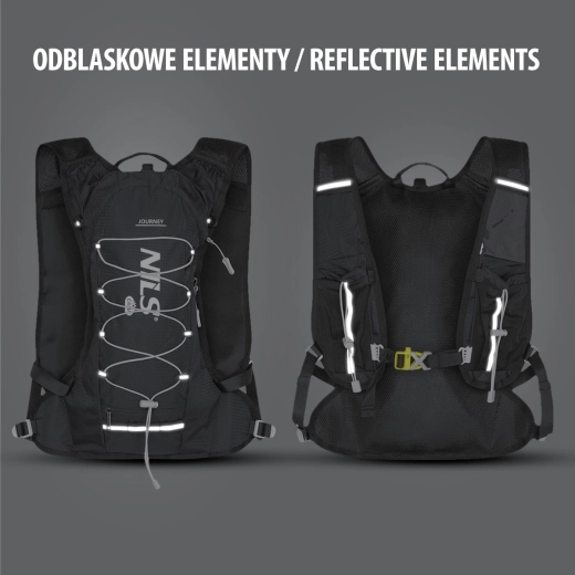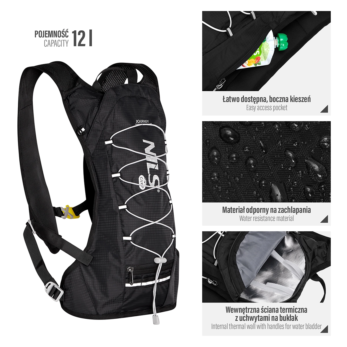 NILS Camp Journey is a compact 12-liter backpack designed for comfortable movement on the trail. Durable ripstop nylon withstands abrasions and is resistant to splashing water. The main chamber includes a divider and mounts for a hydration bladder, while the back panel with aluminum foil helps keep your drink cooler for longer.