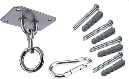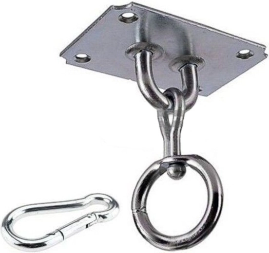Durable ceiling mount for hanging punching bags, speedballs, and speedbags. It offers a 50 kg load capacity, compact dimensions, and easy installation thanks to the included kit. A 6 mm carabiner is included for quick and secure attachment.