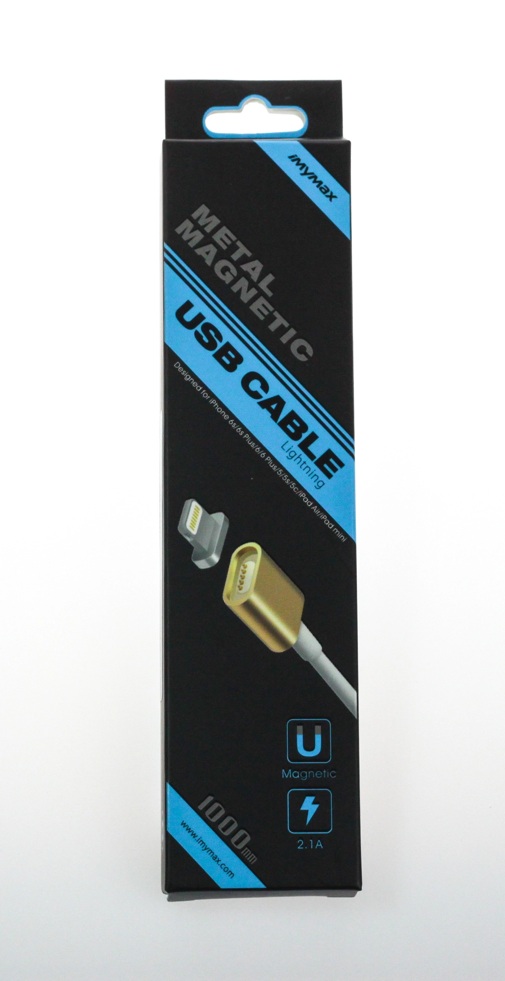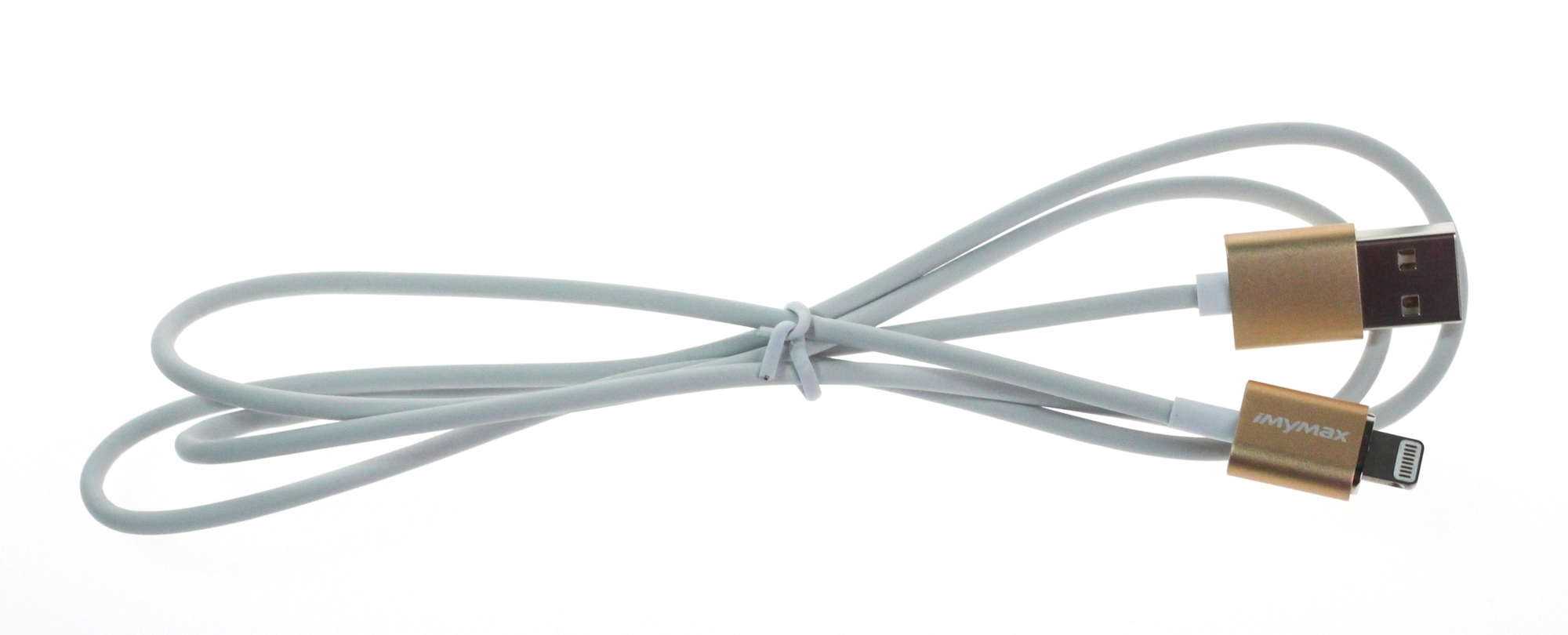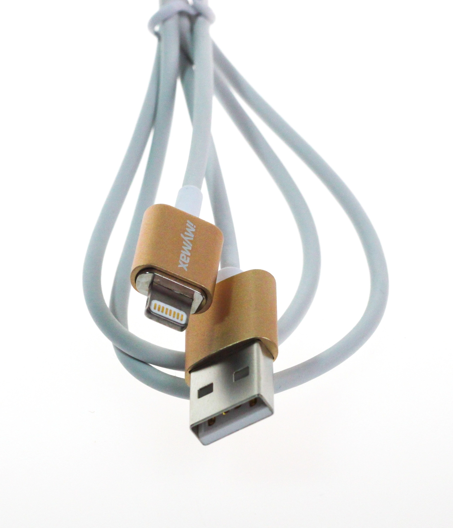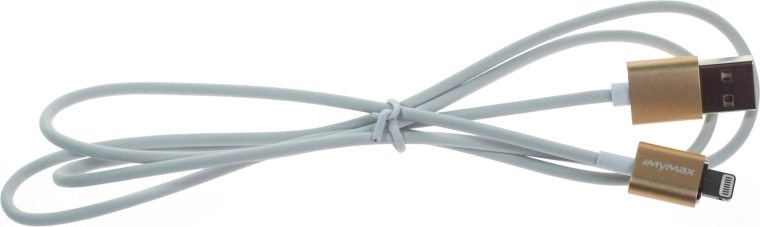 Stylish and durable MyMax Lightning 1 m cable in a gold finish for Apple devices. Supports 2.1 A fast charging, features aluminum connectors, and reliable connection via USB 2.0 and Lightning.