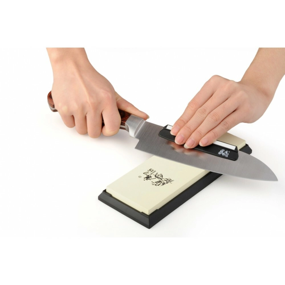 Thanks to its high-quality corundum (aluminum oxide) composition, the stone is durable, grinds evenly, and maintains consistent performance. The non-slip rubber base ensures safe work on the kitchen counter as well as in the workshop. The stone is versatile — you can use it with water or oil, and for convenient use it can be stored long-term submerged in water.