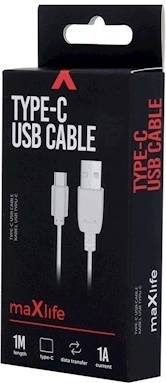 The Maxlife USB‑C cable is a practical accessory for charging speakers, headphones, and older phone models with USB‑C. It offers a stable current up to 1 A, making it great for gentle charging of smaller devices, while also enabling fast file transfers between your phone and computer. The white color and clean finish fit any environment.