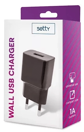 The compact SETTY mains USB charger with output up to 1 A is ideal for everyday charging of your phone, headphones, or MP3 player. Thanks to its universal USB connector and wide input voltage range of 100–240 V, it is a perfect choice both at home and on the go. Reliable and safe operation is ensured by the quality workmanship of SETTY in an elegant black color.