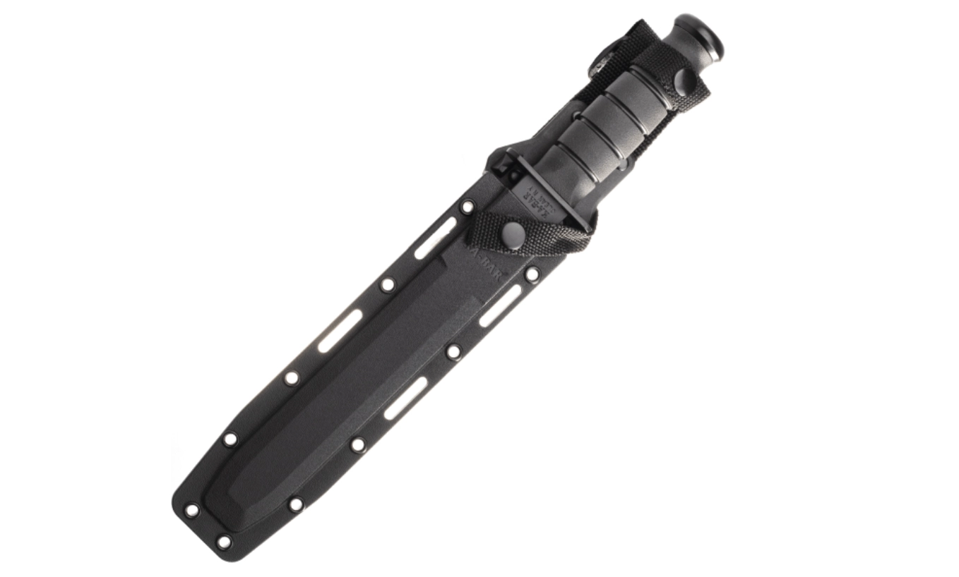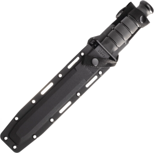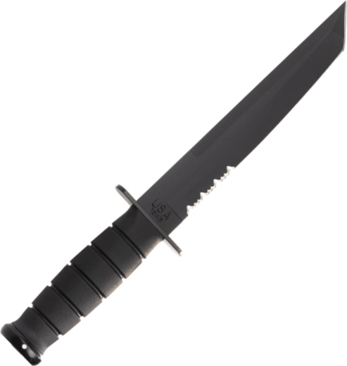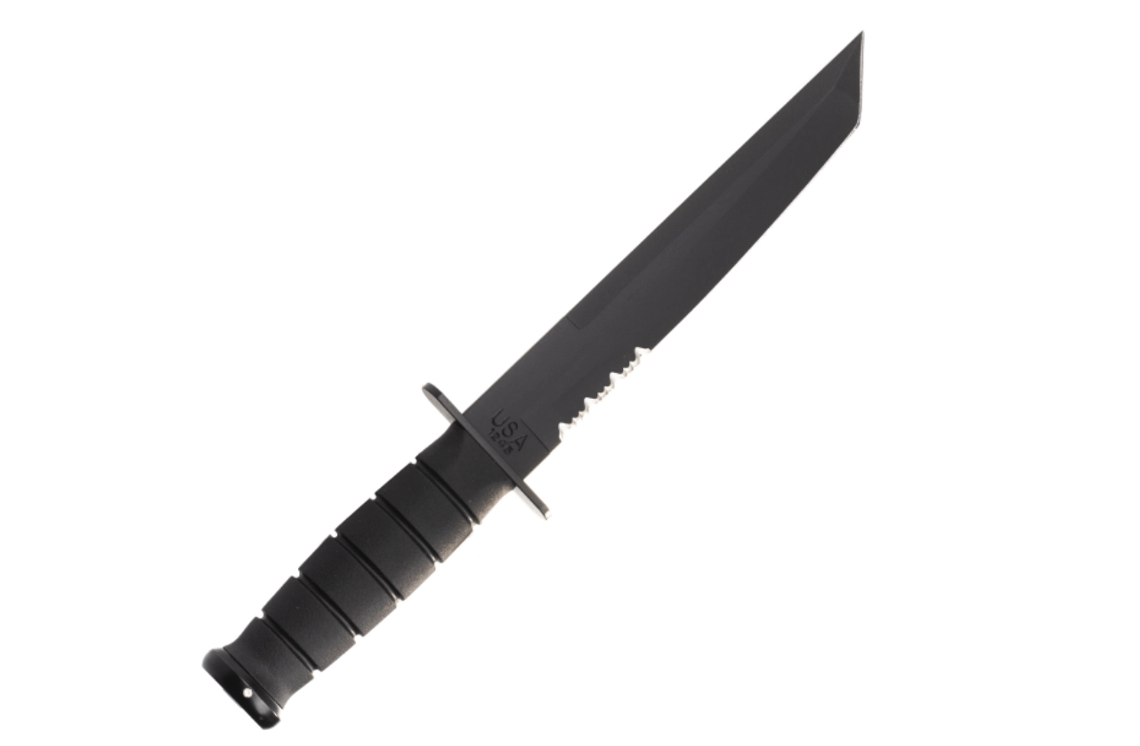 This tactical knife is based on the legendary U.S.M.C. KA-BAR pattern and is designed for reliable performance in demanding conditions. The Tanto blade with a black coating offers excellent penetration and tip strength, while the partially serrated edge efficiently cuts ropes, straps, and tougher materials. The ergonomic Kraton handle provides a secure, non-slip grip even when wet.