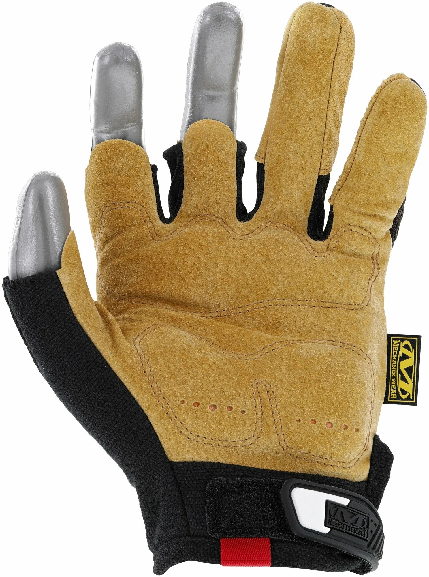 Professional leather gloves MECHANIX Durahide M-Pact Framer in size S/8 for carpenters, joiners, and construction work offer high abrasion resistance, TPR knuckle protection, and precise fingertip feel thanks to the open-thumb, index, and middle-finger design. Breathable TrekDry reduces heat and sweat, D3O padding absorbs impacts and vibrations, and the TPR closure keeps the glove secure at the wrist. Machine washable.