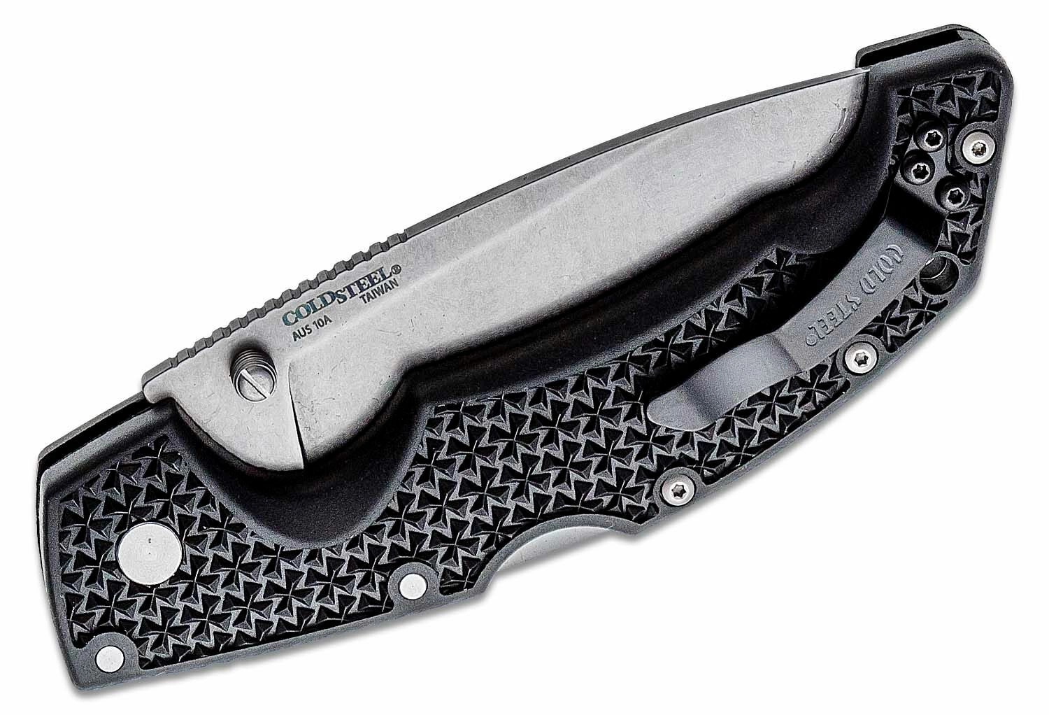The versatile folding knife Cold Steel Voyager Large Drop Point is a reliable choice for hunting, hiking, and everyday carry. It features a Japanese AUS10A steel blade with a stonewash finish, a secure Tri-Ad Lock, a thumb stud for quick opening, and a lightweight yet durable Griv-Ex handle with a pocket clip.