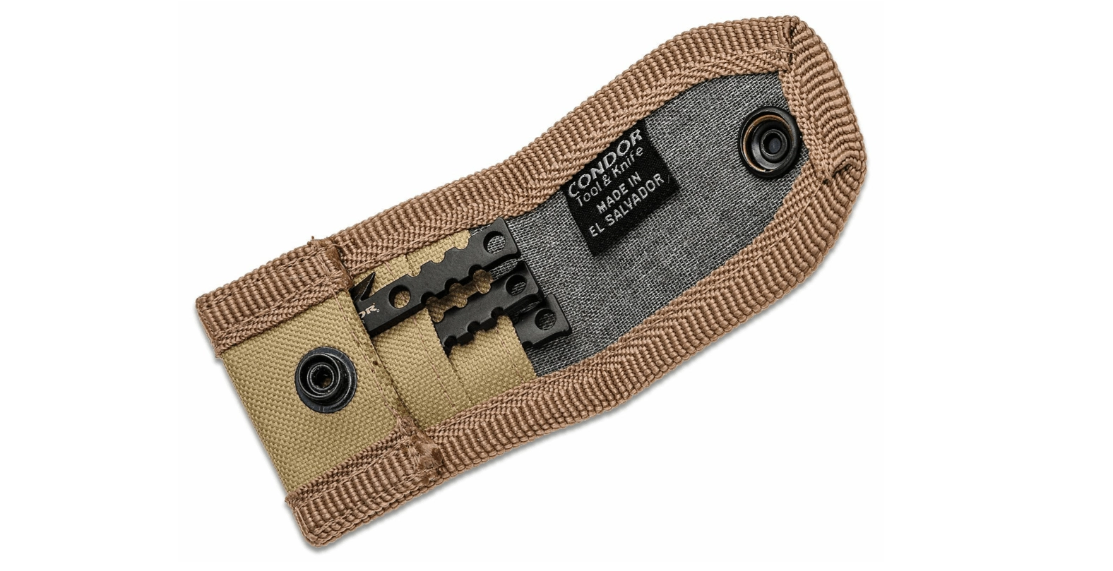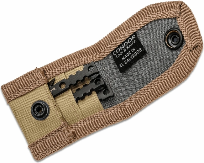 The 1075 carbon steel points offer an excellent balance of strength and flexibility. Lower holes and notches allow reliable attachment to a wooden or improvised shaft, letting you create an effective spear in moments. Compact dimensions and the nylon sheath ensure safe, tidy storage in a pack or pocket.