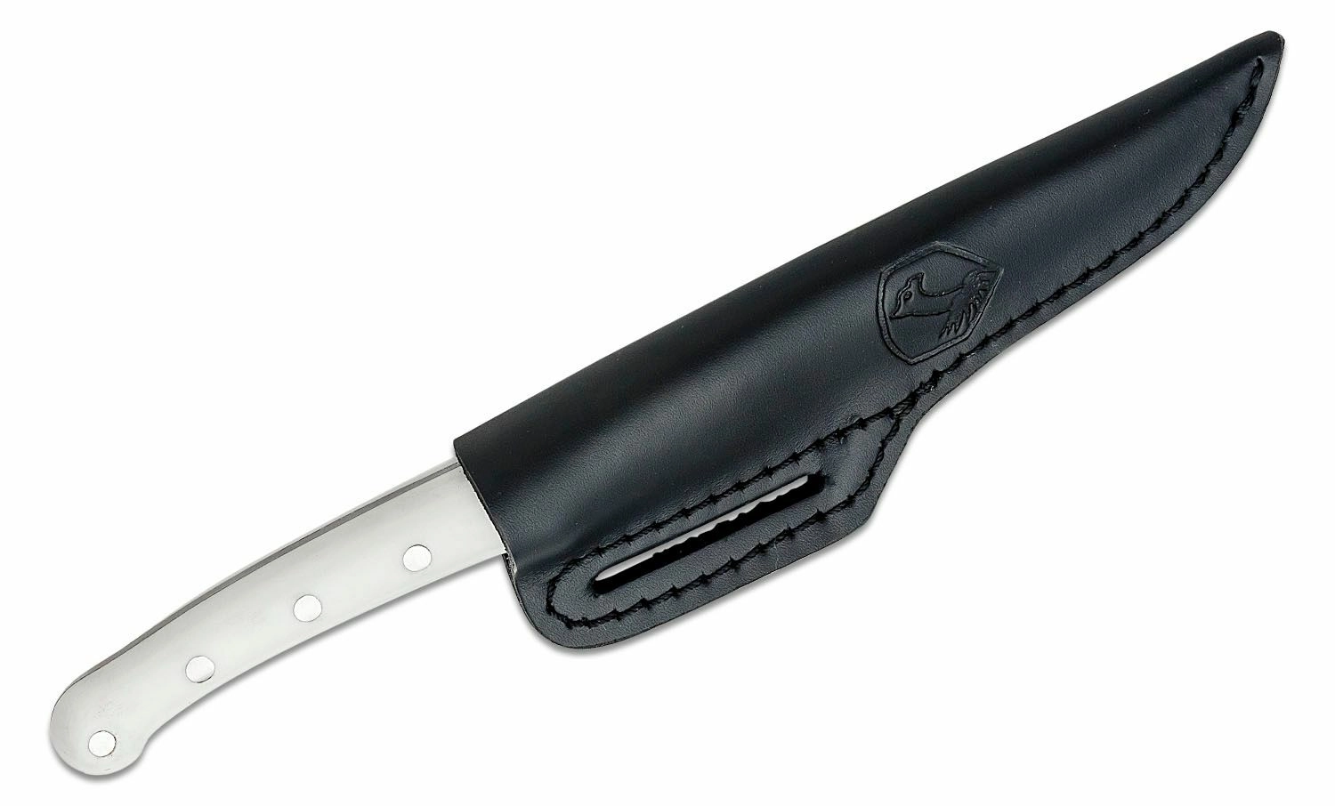 The ergonomic white handle made of durable Micarta provides a secure grip even when wet, and the riveted attachment enhances overall robustness. The knife comes with a leather sheath for safe and convenient belt carry.