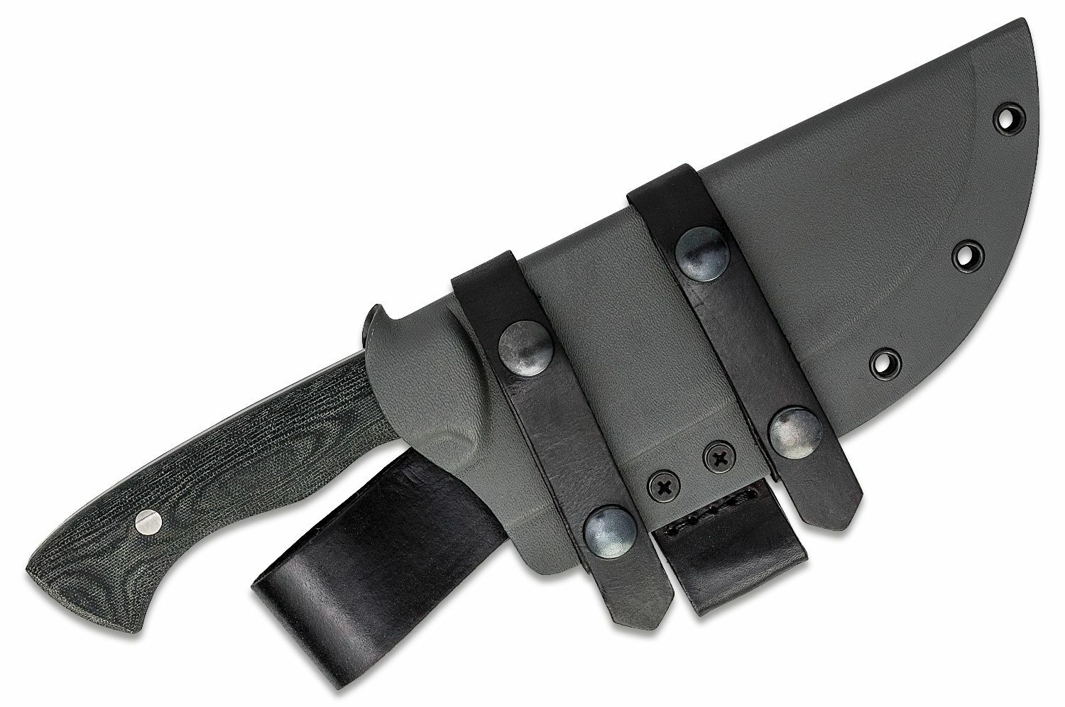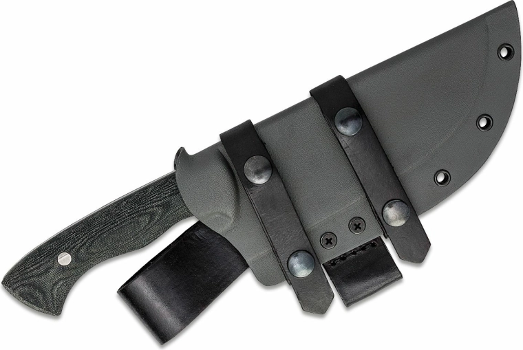 The ergonomically shaped handle made from grey Micarta ensures a secure and comfortable grip even in demanding conditions. It includes a combined kydex and leather sheath for safe carry and quick access in the field. To preserve the properties of carbon steel, we recommend drying the blade after use and occasionally treating it with oil.
