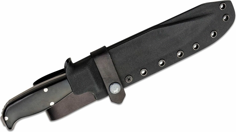 The black Micarta handle offers a safe and comfortable grip even when wet or while wearing gloves. The integrated striking pommel at the end of the handle serves as an emergency hammer. The knife comes with a sturdy Kydex sheath with a leather loop for multiple carry options.