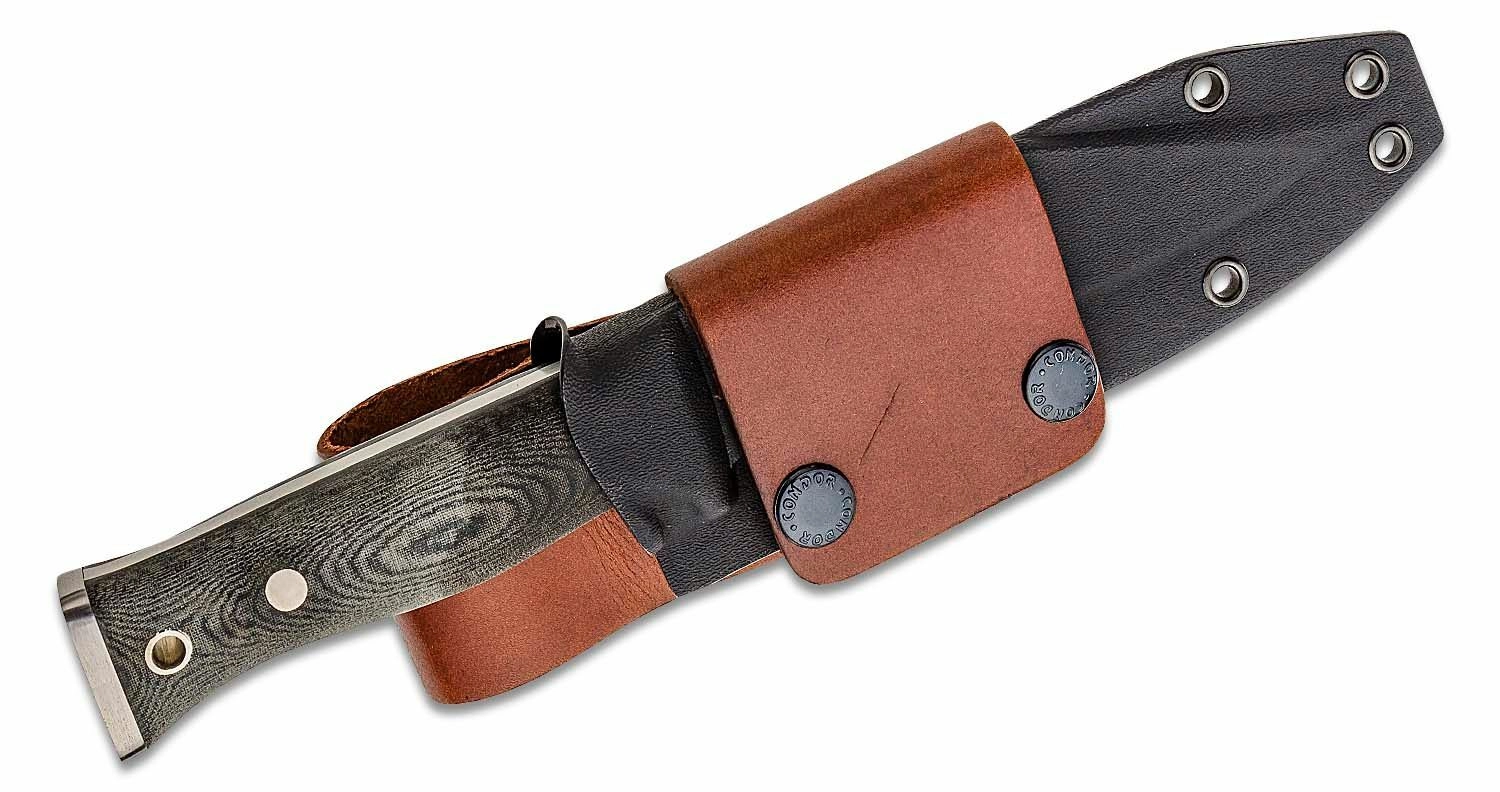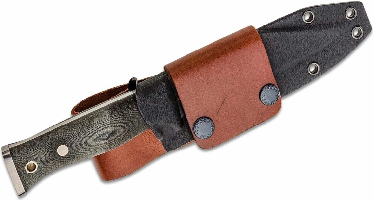 The ribbed Micarta handle in black-grey sits securely in the hand even with gloves and features a striking/breaking pommel for glass-breaking. The solid full-tang construction boosts durability during batoning and heavier tasks. The knife comes with a combined Kydex + leather sheath for secure and versatile carry.