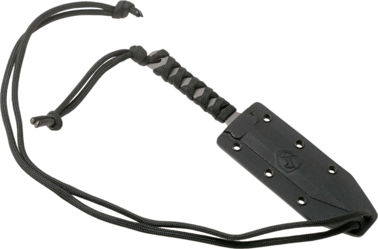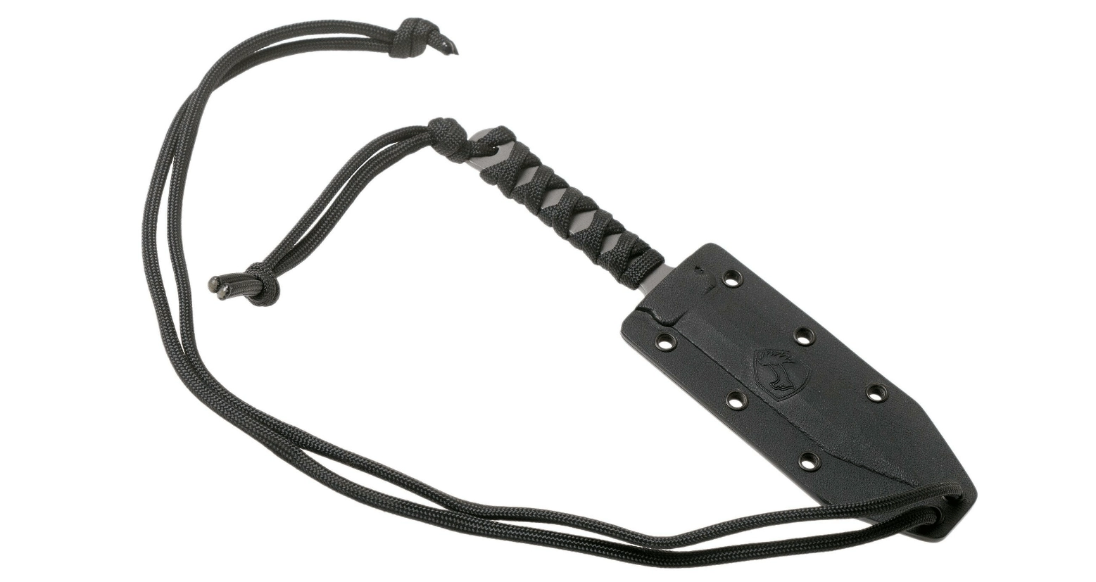 Compact neck knife inspired by the Roman gladius. Fixed 1075 carbon steel blade with a full-tang construction, paracord for a secure grip, and a lightweight plastic sheath with a neck cord for comfortable carry.