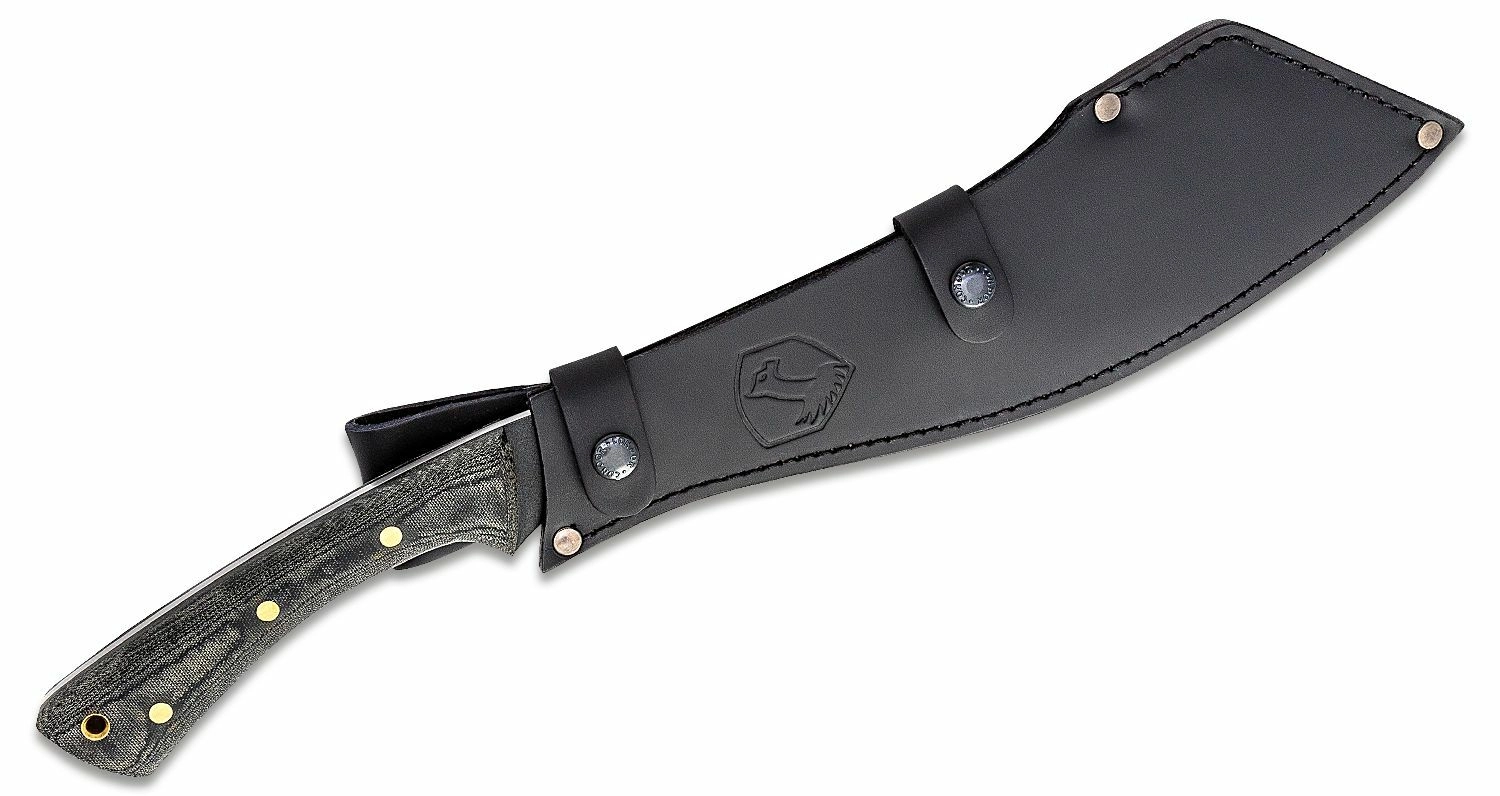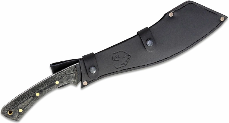 The blade made of 1075 high carbon steel with a black epoxy powder-coated finish resists corrosion and abrasion well and is easy to re-sharpen. The ergonomic Micarta handle with a fine texture provides a secure grip even with gloves or in wet conditions. A quality leather sheath is included for safe carry.