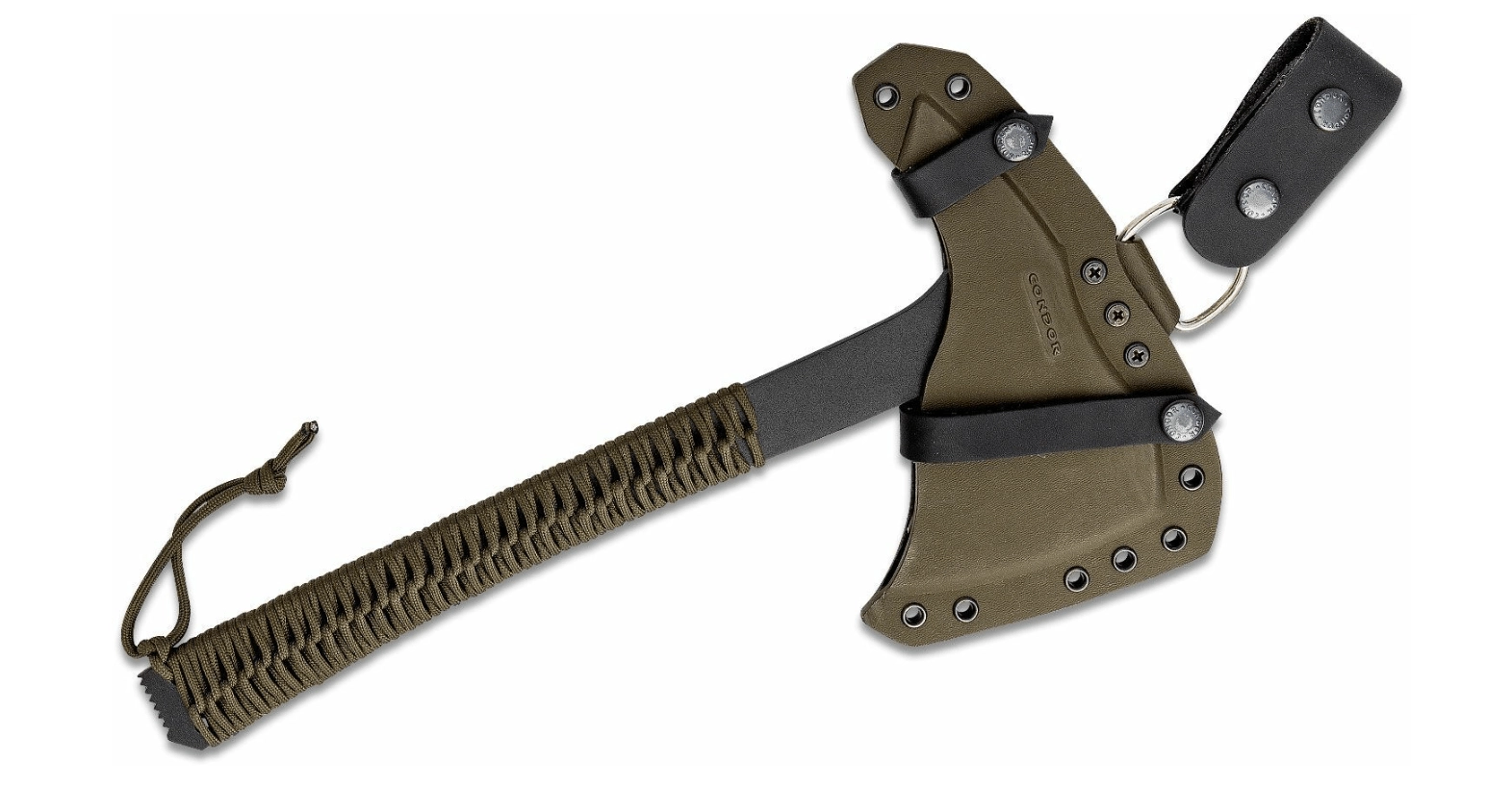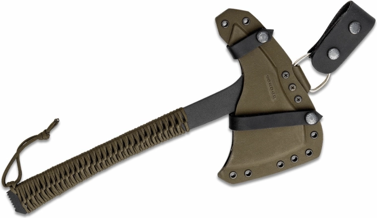 The robust and versatile Condor Sentinel Axe Army Green tomahawk handles chopping, cutting, prying, breaking, breaching, and throwing. The full-steel 1075 carbon steel construction with a black finish and a paracord handle ensures high durability as well as a comfortable and secure grip. Includes a rigid Kydex sheath by 710 Custom Sheaths for carry on a belt, backpack, or gear.