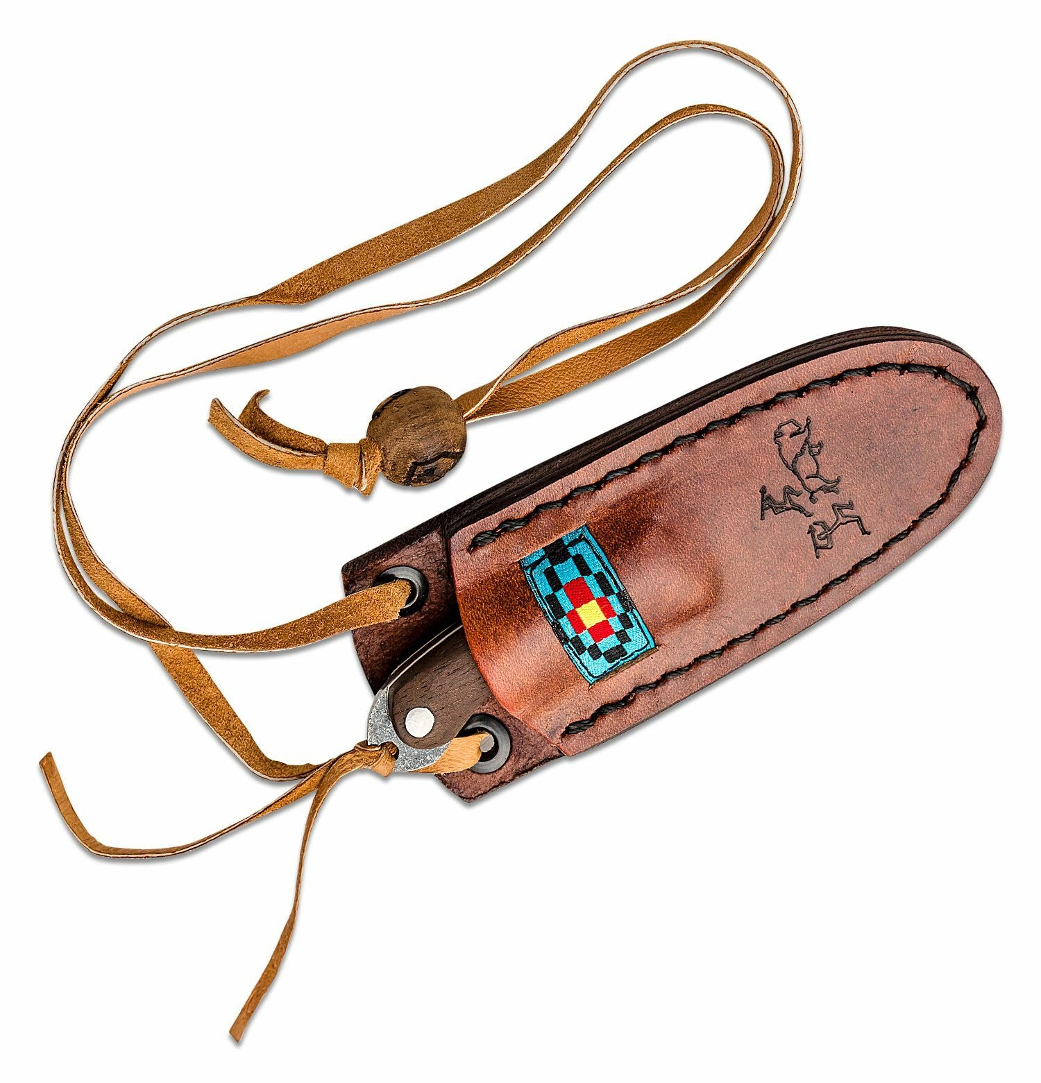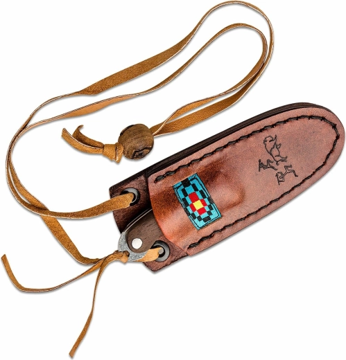 The walnut wood handle complemented by turquoise stone provides a comfortable, confident grip even in adverse conditions. The knife comes with a leather sheath decorated with a hunting motif and a cord, allowing safe and stylish neck carry.