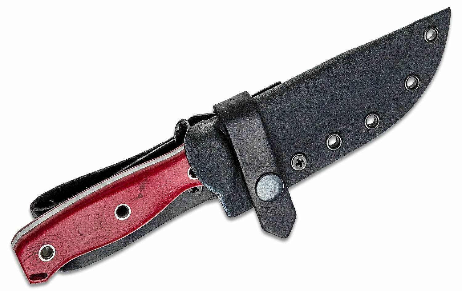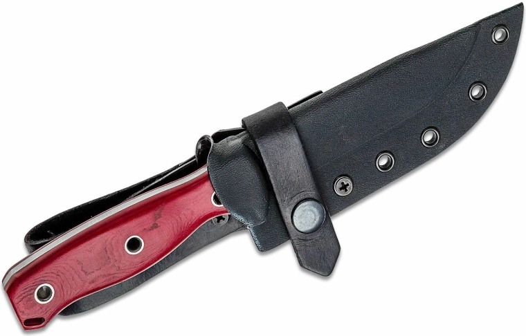 The 3D-milled red Micarta handle is firmly attached with three hollow pins and provides excellent traction even when wet. Prominent thumb ramps on the spine of the handle offer confidence for fine, detailed work. The package includes a durable Kydex sheath complemented by leather elements for comfortable and secure carry in the field.