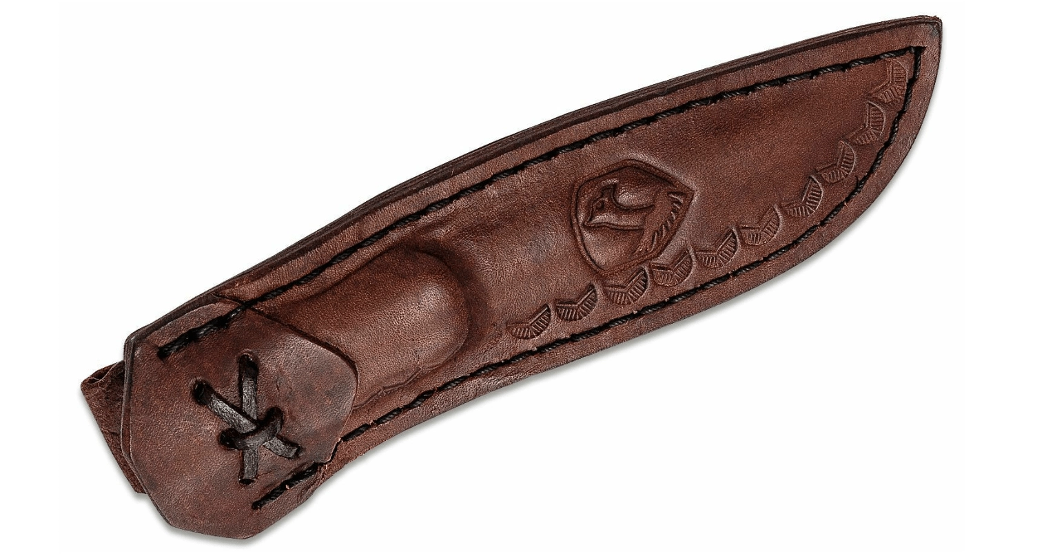The handle made from quality walnut wood is secured with three brass rivets and adorned with a brass wire, adding both aesthetics and grip stability. The handcrafted leather sheath allows comfortable and safe belt carry so you always have the knife at hand.