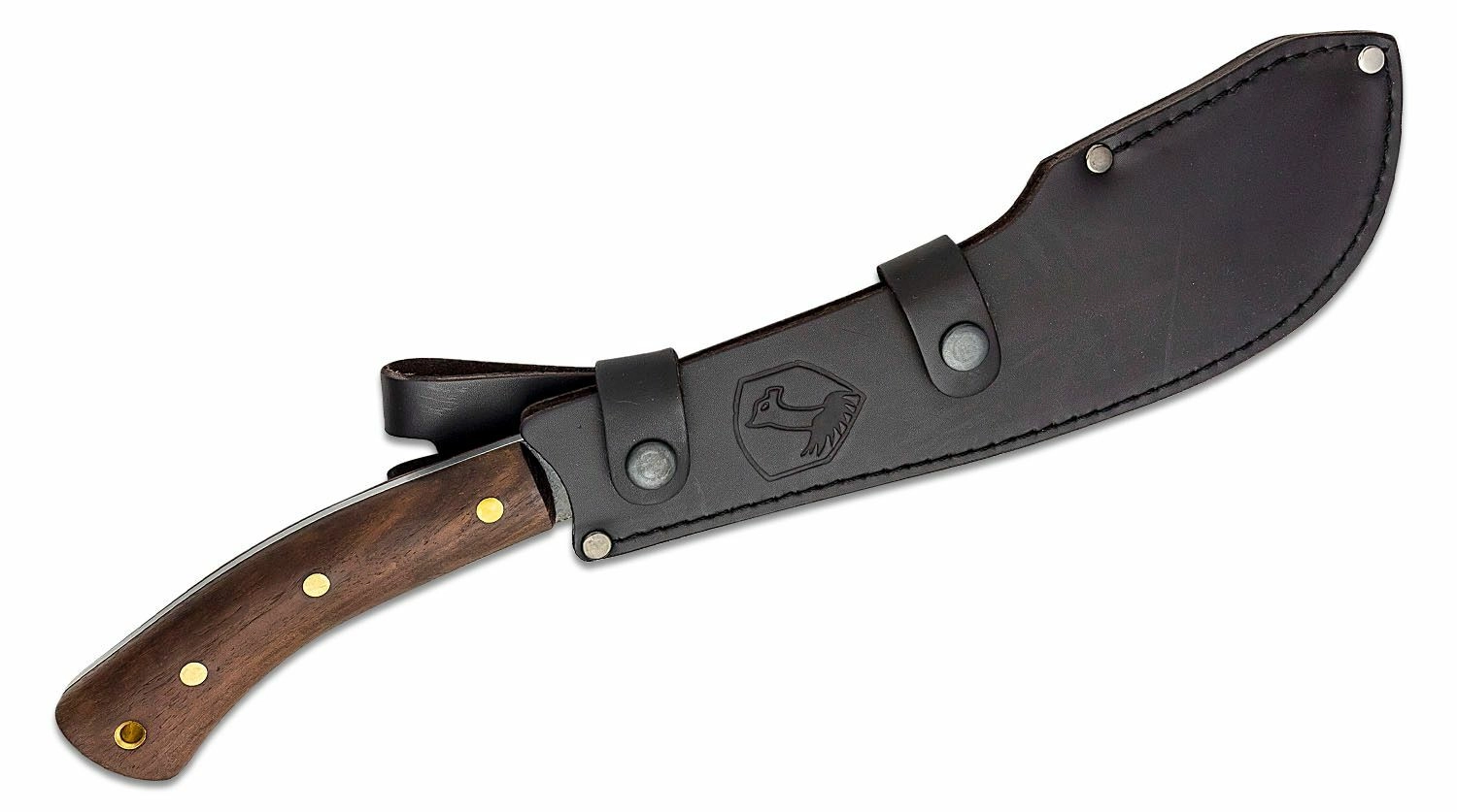 The ergonomic hardwood handle is secured with brass rivets, and the lanyard hole lets you secure the machete against slipping. A quality leather sheath is included to protect the blade and allow comfortable carry on your outdoor adventures.