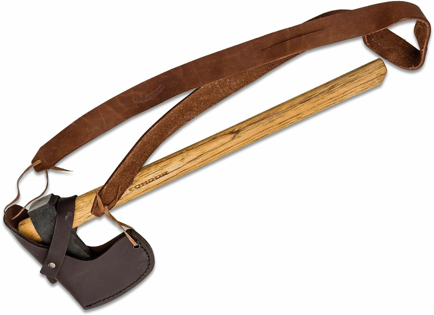 The American hickory handle is known for its flexibility and toughness. It is replaceable, so you can easily fit a new one if needed, or craft your own to your preference. The package includes an elegant leather sheath with a shoulder strap for safe storage and comfortable carry.