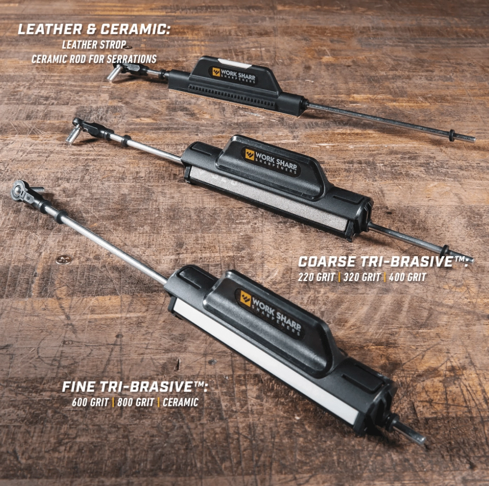Two ergonomic Tri-Brasive® handles offer a wide range of abrasives for every stage of edge care: from repairs and fast material removal, through precise honing, to final polishing. The set includes diamond plates in grits 220, 320, 400, 600, and 800, a fine ceramic plate, and a leather strop for a mirror finish. For serrated knives, use the ceramic rod to easily restore the sharpness of individual teeth.