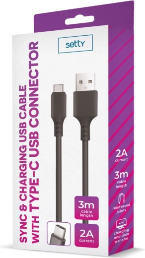 Setty USB to USB‑C Cable 3 m, 2 A, Black