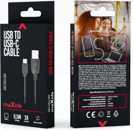 The universal Maxlife USB – USB‑C cable with a length of 0.5 m is ideal for everyday use. It provides fast charging up to 2 A, reliable data transfer, and thanks to its compact length, it’s great for the office, car, and travel. The flexible and durable design ensures convenient use with newer phone models and other electronics.