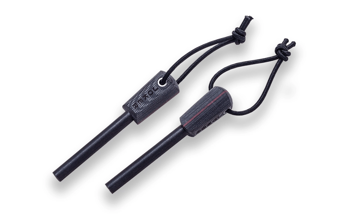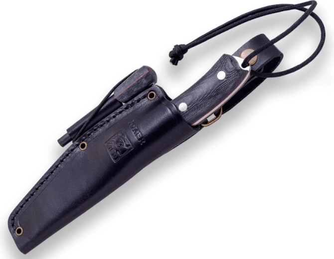 The Micarta handle in black with red accents sits securely in the hand even when wet. The knife is complemented by a quality leather sheath for safe carry, a practical fire starter for lighting a fire, and paracord (2 m) for emergencies in the outdoors.