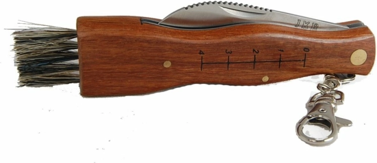 Practical mushroom knife JOKER with a 7 cm stainless steel blade has an ideal shape for cleaning mushrooms. It offers a wooden handle with carabiner, a scale for approximate measuring, and a brush for cleaning mushrooms. The package includes a nylon sheath for safe carry in the field.