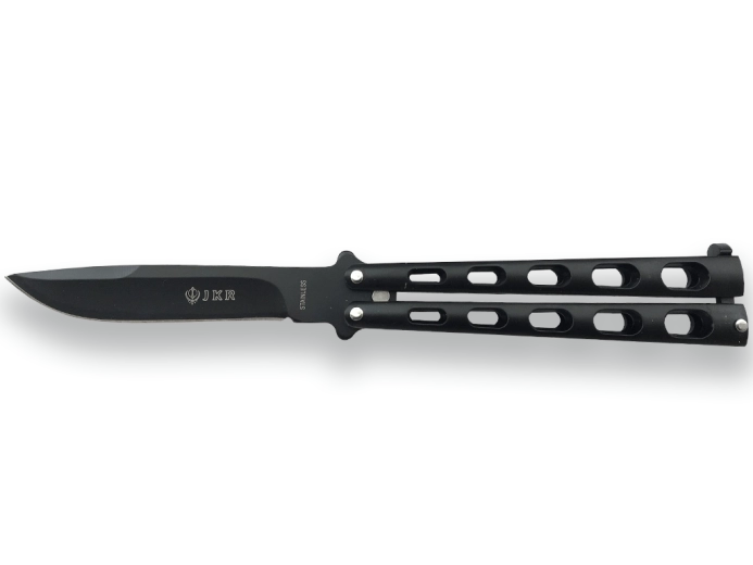 Balisong pocket knife for everyday carry with a 10.5 cm blade. Features a single-edged stainless steel blade with a protective coating, a secure lock in the open position, and a durable all-black zinc handle for a confident grip.