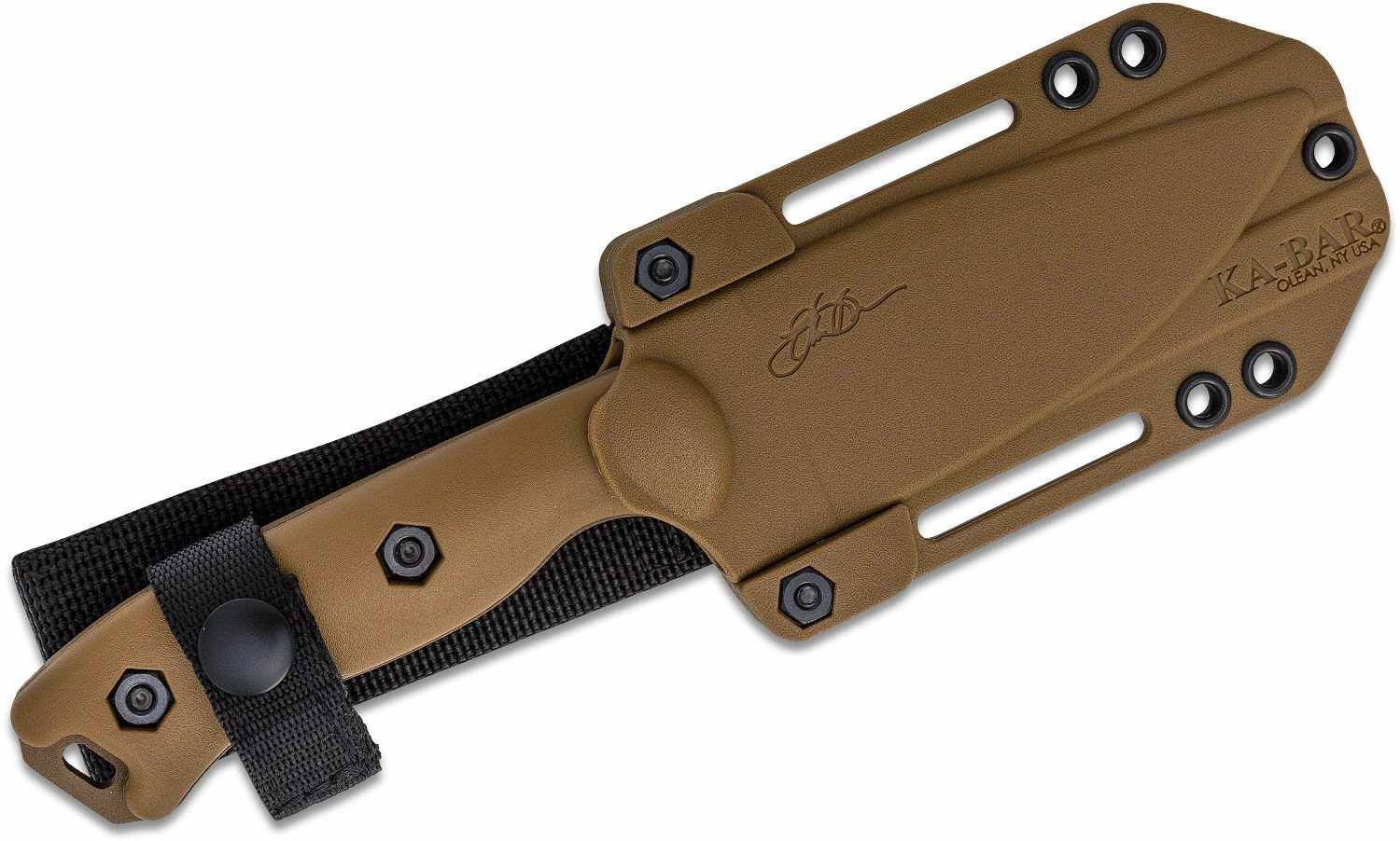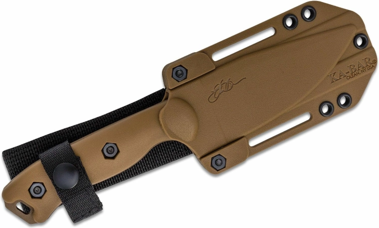 The ergonomic Zytel handle in a sand brown shade sits well in the hand even with gloves, and the lanyard hole expands retention options. The polymer sheath provides reliable knife retention when carried on a belt or gear.