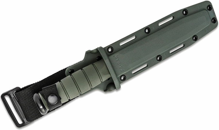 Robust KA-BAR tactical knife for demanding field use and outdoor activities. It features a solid 1095 Cro-Van blade with a black anti-corrosion finish, a non-slip Kraton handle in green, and a plastic sheath for safe carry.